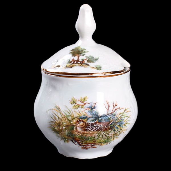 Горчичница с крышкой Bernadotte «Охота» объемом 0,15 л — это подлинный шедевр среди столовых аксессуаров, который не просто служит функциональной посудой, а задаёт тон всей сервировке. Её обтекаемые формы и изящная крышка венчают изысканную композицию охотничьего пейзажа — сцены, будто бы выписанные кистью художника. Живописное изображение утки в траве переносит вас в пасторальный уголок европейского леса, а золотая кайма придаёт роскошное завершение этому изысканному предмету.