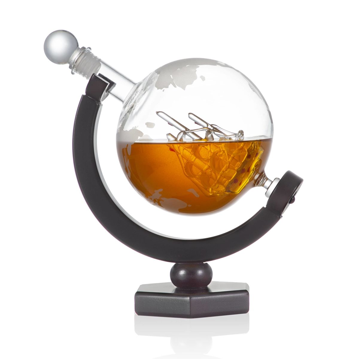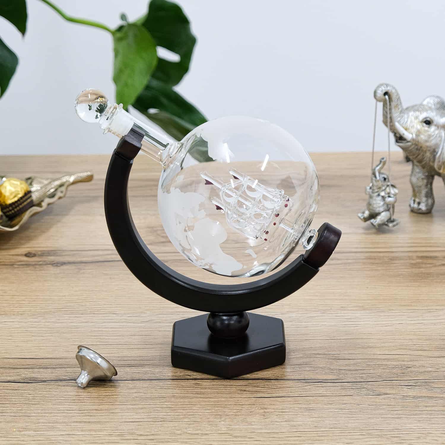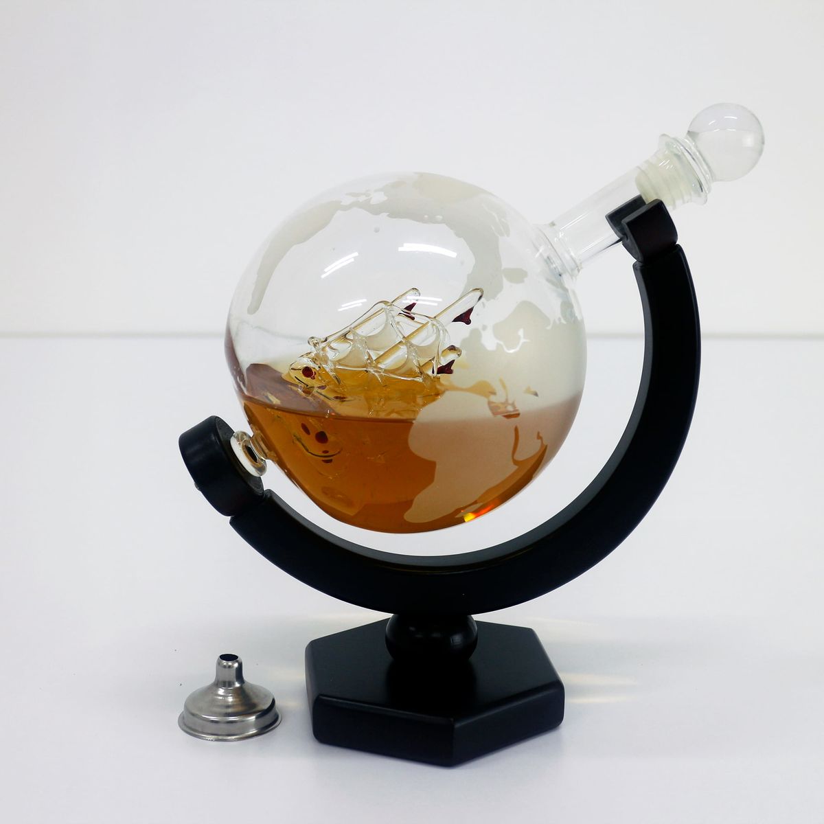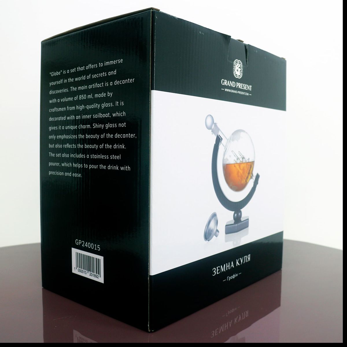 Виготовлений із прозорого скла, в якому розміщений витончений скляний вітрильник – символ подорожей, свободи та мрій. На поверхні графину нанесені континенти з ніжною матовою текстурою, що відбивають безмежність світу та різноманітність його культур.