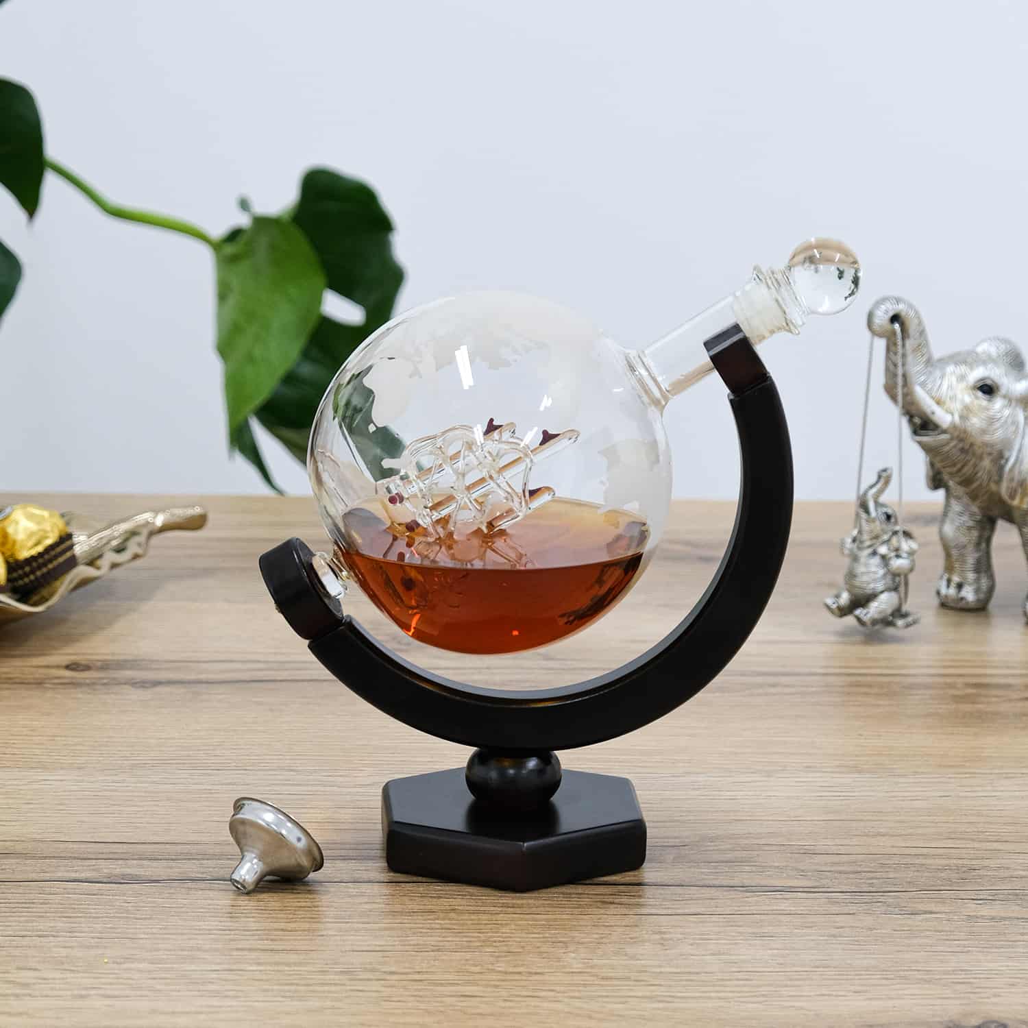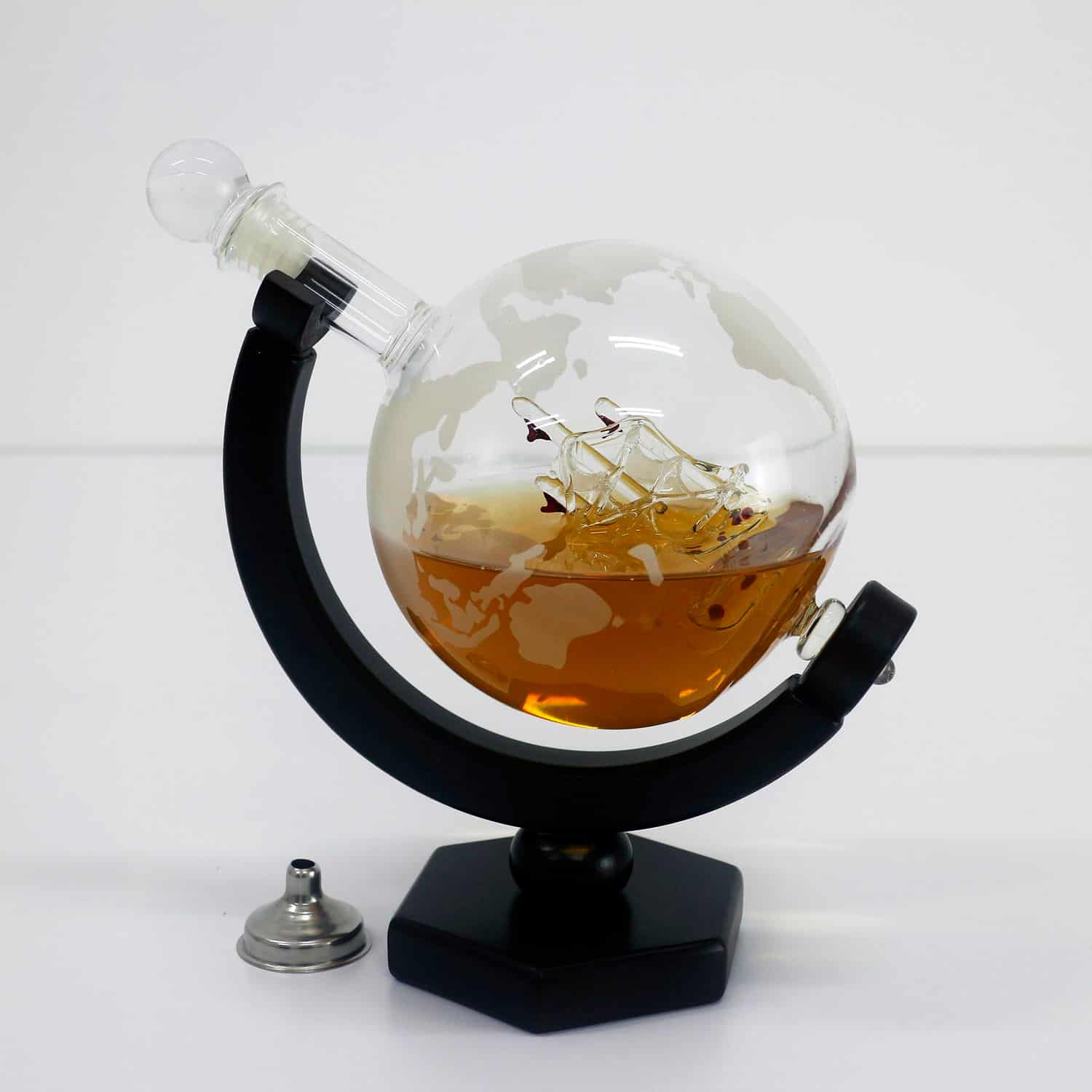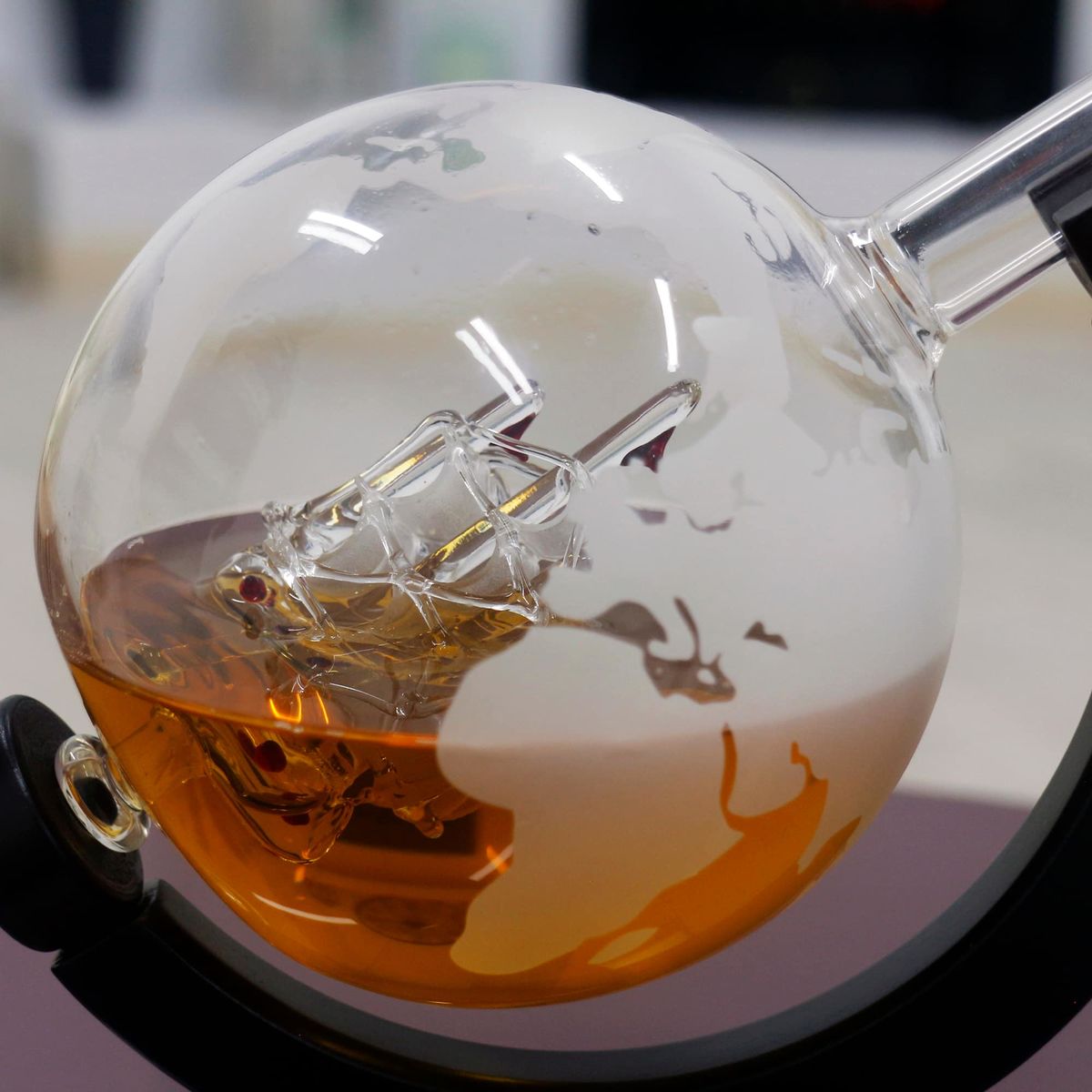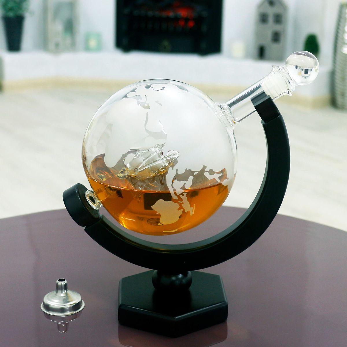 Виготовлений із прозорого скла, в якому розміщений витончений скляний вітрильник – символ подорожей, свободи та мрій. На поверхні графину нанесені континенти з ніжною матовою текстурою, що відбивають безмежність світу та різноманітність його культур.