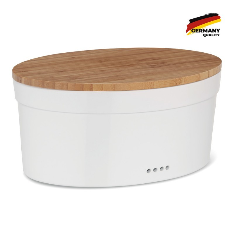 Хлебница Kela Salena изготовлена из керамики, крышка – из бамбука. В хлебнице предусмотрены специальные отверстия, благодаря которым внутрь емкости попадает воздух и хлеб сохраняет свою свежесть надолго.