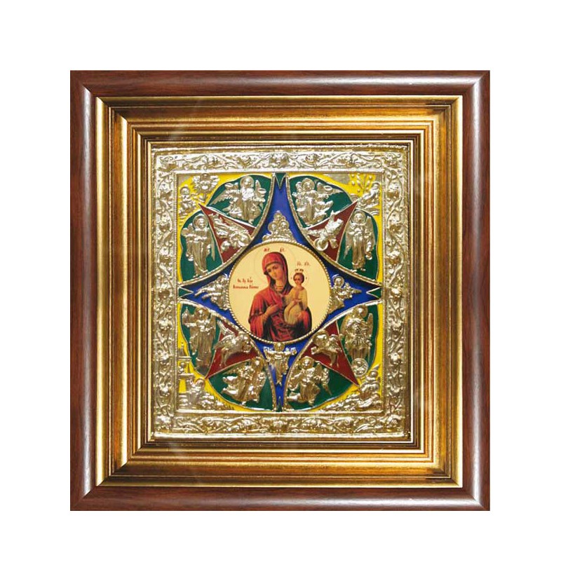 В иконописи Неопалимая Купина – это прообраз Пресвятой Девы, который указывает на ее чистоту и непорочность зачатия Христа. В этой иконе раскрываются важнейшие образы и сюжетные линии, описанные в Ветхом Завете. Изначально, Неопалимой купиной был горящий и несгорающий в огне куст терновника, в котором Моисею явился Бог и призвал вывести жителей Израиля на поиски Земли Обетованной. На этой иконе образ Божией Матери с младенцем на руках расположен в центре иконы. Также она иногда держит на руках атрибуты пророчеств, описанных в Ветхом Завете, например Гору из пророчества Даниила, Лестницу Иакова, Врата Иезекииля и т. п. Ее образ обрамлен в восьмиконечную звезду, которая в свою очередь состоит из двух четырехконечных звезд. В четырех углах иконы изображены ветхозаветные сюжеты: Моисей перед Купиной, сон Иакова, Врата Иезекииля и Древо Иессеево. Также важное место занимают изображенные ангелы в лучах звезды с лицами, обращёнными к Пресвятой Деве. Они почитают ее и поклоняются чудесному рождению Сына Божьего. Икона Неопалимая Купина считается заступницей перед пожарами, оберегая Ваш дом от этого бедствия. Кроме того, она - целительница душ, усмиряя сомнения в душе, помогает найти истинный путь.