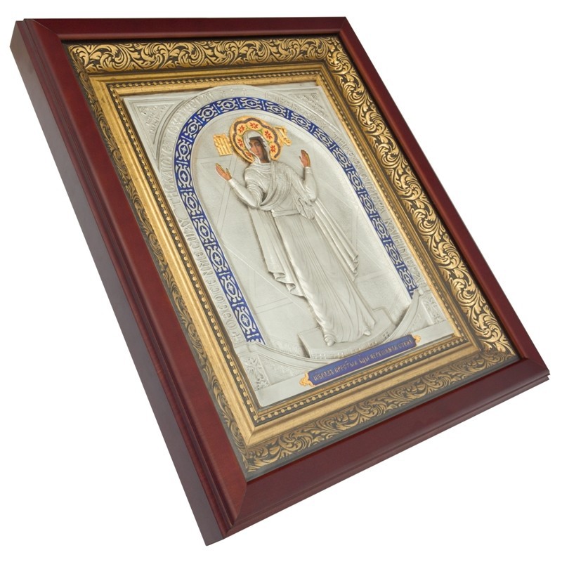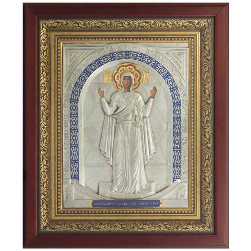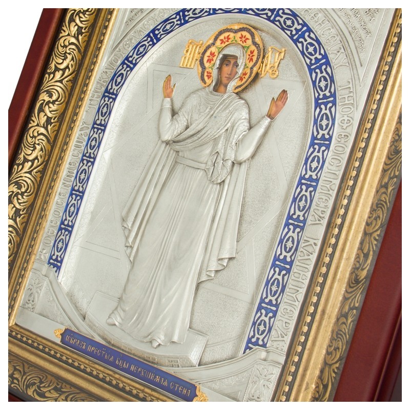Икона «Богоматерь Нерушимая стена» почитается как чудотворная. Ее образ списан с мозаичного изображения Богородицы под куполом Киевского Софиевского собора. На этой иконе Богородица Оранта изображена в традиционном образе заступничества с раскрытыми ладонями и руками, возведенными к небу. Вокруг полусвода выложена надпись на греческом: «Бог посреди ея и не подвижется: поможет ей Бог утро заутра». Икона получила название «нерушимая стена», поскольку именно этот образ Богородицы оберегал Софиевский собор на протяжении многих веков. Независимо от того, сколько раз Киев подвергался нападениям и разрушению, собор оставался нерушимым. Поставив эту икону в доме, заступничество Богоматери будет прочной стеной для вашей семьи, ограждающей от болезней и невзгод.