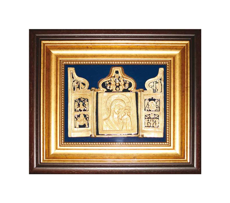 - Материал: медь, позолота, эмали, рама из натурального дерева