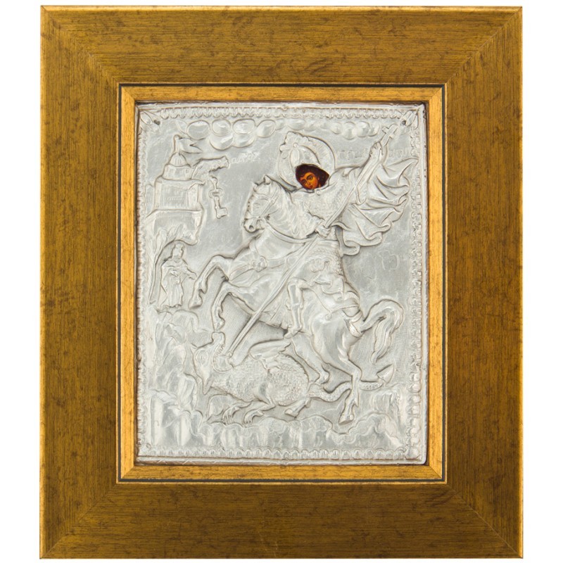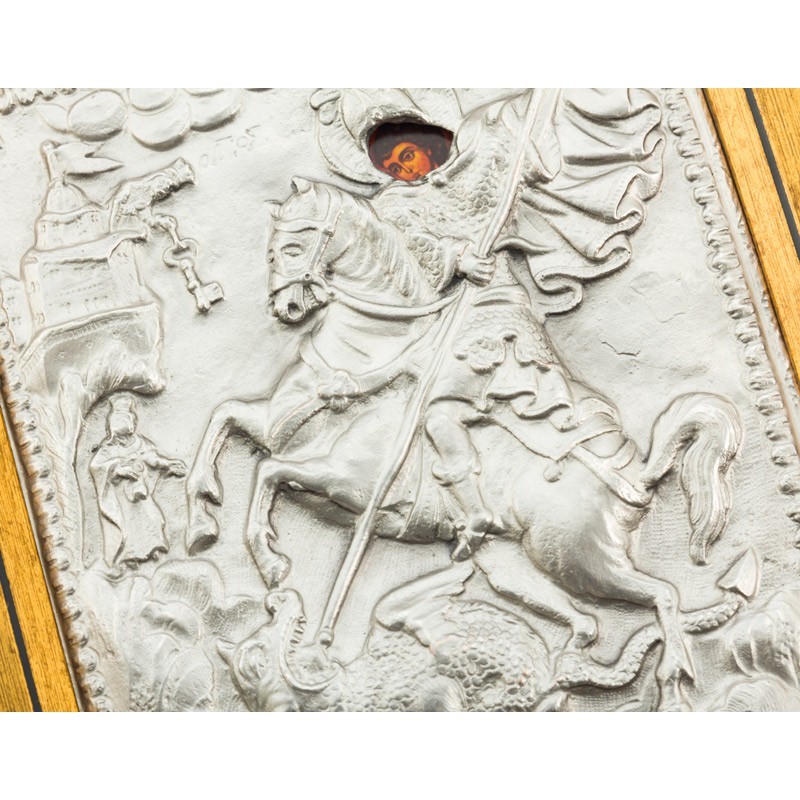 Святой Георгий Победоносец, не смотря на то, что родился в Риме и прожил свою жизнь как римский военно-подданный, воспитывался в христианской семье и исповедовал православие, за что и был казнен императором. При жизни Георгий прославился многими великими деяниями в защиту христианской веры. Самым распространенным сюжетом иконографии, связанным с Георгием, считается его победа над змием. По легенде змий выжигал поля и разорял земли одного языческого правителя в городе Бейруте. Когда чудовище покусилось на жизнь царевны, появился Георгий Победоносец и пронзил его копьем. Поразившись мужеством и силой православного спасителя, иноверцы приняли христианство. Это сказание часто растолковывают как спасение церкви (царевны) от язычества (змий). Великомученик Георгий считается покровителем всех военных, помогая в успешном несении службы, вместе с тем икона с его изображением защищает и всю семью военнослужащего.