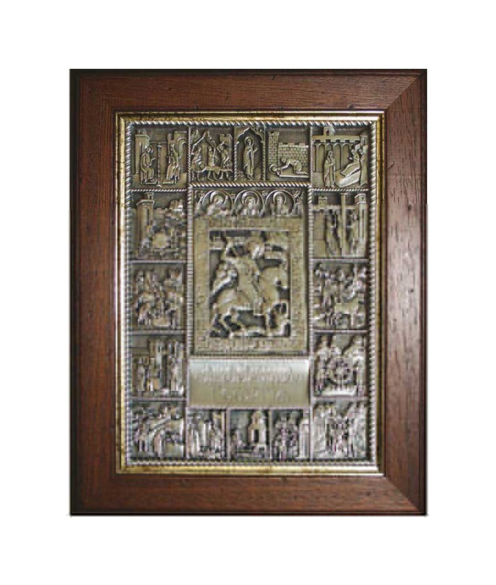 Святой Георгий Победоносец, не смотря на то, что родился в Риме и прожил свою жизнь как римский военно-подданный, воспитывался в христианской семье и исповедовал православие, за что и был казнен императором. При жизни Георгий прославился многими великими деяниями в защиту христианской веры. Самым распространенным сюжетом иконографии, связанным с Георгием, считается его победа над змием. По легенде змий выжигал поля и разорял земли одного языческого правителя в городе Бейруте. Когда чудовище покусилось на жизнь царевны, появился Георгий Победоносец и пронзил его копьем. Поразившись мужеством и силой православного спасителя, иноверцы приняли христианство. Это сказание часто растолковывают как спасение церкви (царевны) от язычества (змий). Великомученик Георгий считается покровителем всех военных, помогая в успешном несении службы, вместе с тем икона с его изображением защищает и всю семью военнослужащего.