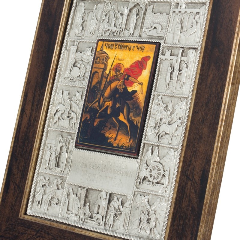 Святой Георгий Победоносец, не смотря на то, что родился в Риме и прожил свою жизнь как римский военно-подданный, воспитывался в христианской семье и исповедовал православие, за что и был казнен императором. При жизни Георгий прославился многими великими деяниями в защиту христианской веры. Самым распространенным сюжетом иконографии, связанным с Георгием, считается его победа над змием. По легенде змий выжигал поля и разорял земли одного языческого правителя в городе Бейруте. Когда чудовище покусилось на жизнь царевны, появился Георгий Победоносец и пронзил его копьем. Поразившись мужеством и силой православного спасителя, иноверцы приняли христианство. Это сказание часто растолковывают как спасение церкви (царевны) от язычества (змий). Великомученик Георгий считается покровителем всех военных, помогая в успешном несении службы, вместе с тем икона с его изображением защищает и всю семью военнослужащего.