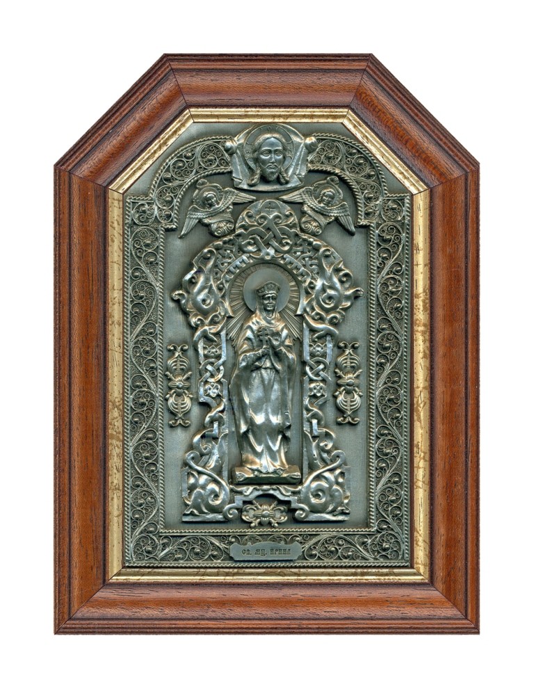 Как-то раз в окно к святой прилетели три птицы — орел с венком ,голубь с масличной веткой и ворон со змеей. Наставник истолковал знамение птиц так, что голубь означает добродетелей Пенелопы — смирение, кротость и целомудрие, масличная ветвь — благодать Божия, которую получают в Крещении; ворон со змеей знак того, что диавол ополчится на нее и будет доставлять печали, скорби и гонения; орел — знамение высоты духа, достигаемой через богомыслие, венок, который принес за победу награду от Господа над невидимым врагом как. В конце рассказа наставник добавил, что Господь желает обручить ее Себе и что она за своего Небесного Жениха претерпит многие страдания. Услышав такой рассказ наставника, Пенелопа отказалась от замужества, от апостола Тимофея приняла Крещение, и стала, наречена Ириной. Материал: медь, серебрение, позолота, эмали, испанский багет- Женские именные иконы