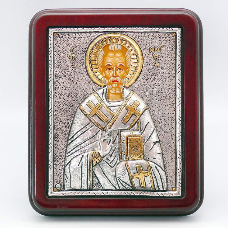 Иконы Argiropoulos изготовлены на основе твердого полиэстера, который покрыт листом чистого серебра 999, с нанесением сверху серебра позолоты в 24К и инкрустированные частично кристаллами Сваровски (sw). Все лики (кроме маленького размера М -9,5х12, в котором использована шелкография) рисованные вручную. Иконы обрамлены в деревянные рамки цвета ореха и вишни и покрыты лаком. В каждую икону вставлен паспорт с описанием и металлическая подставка.