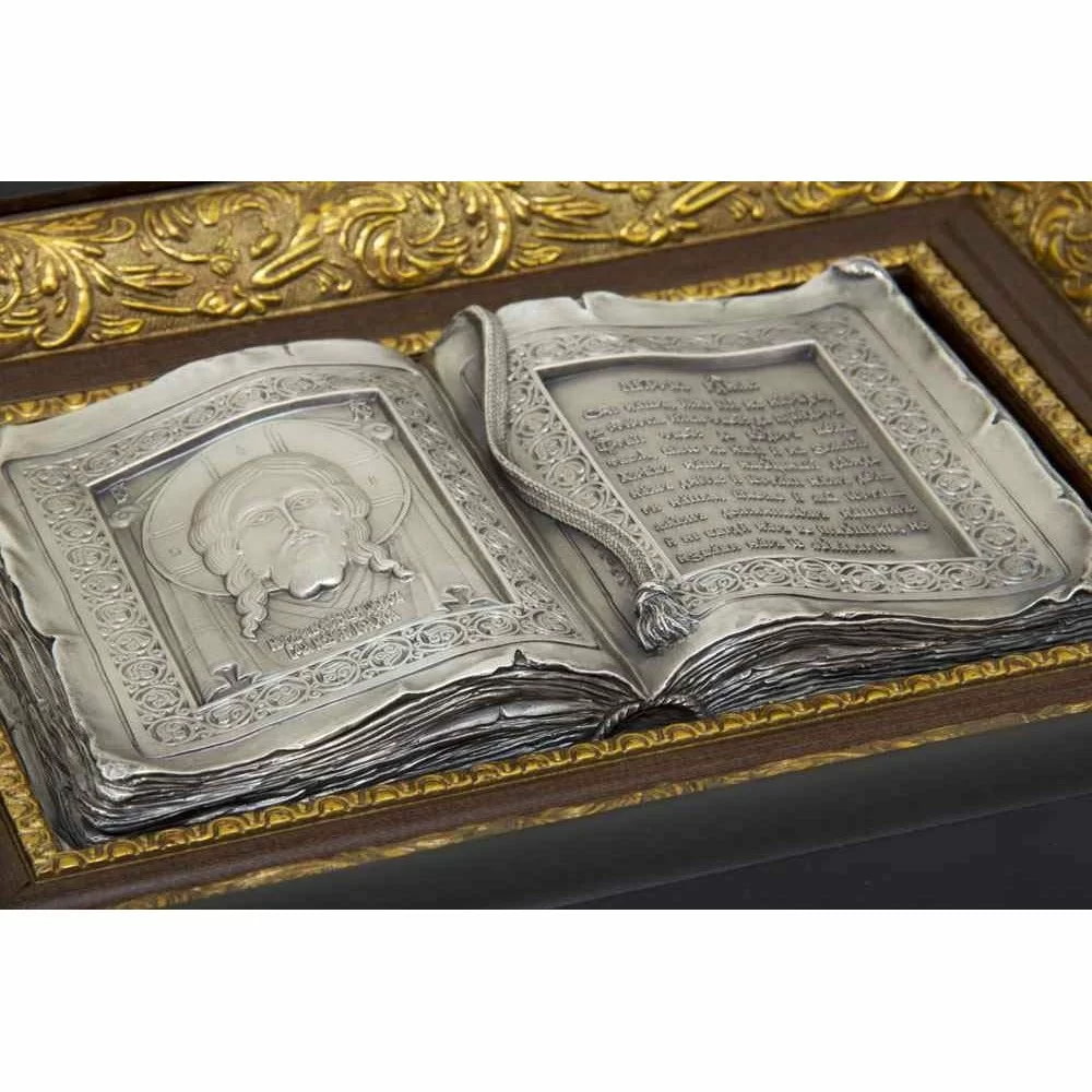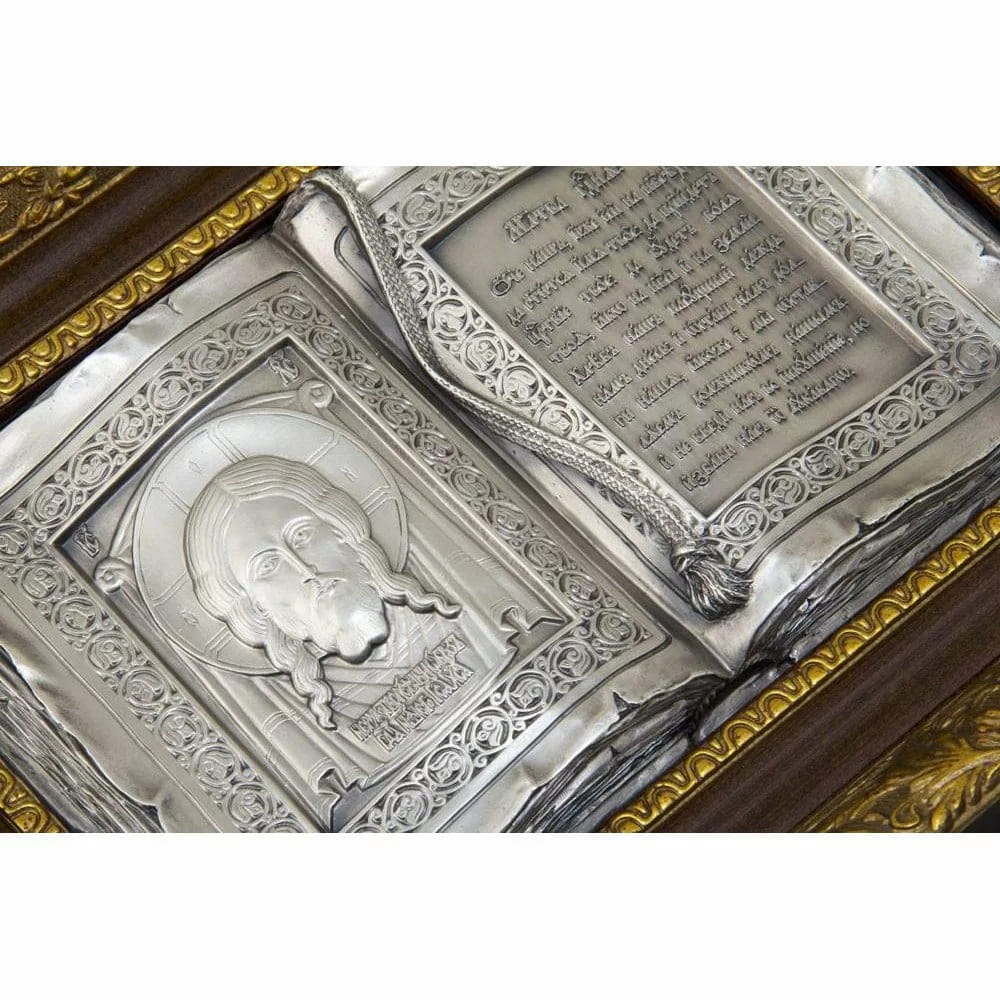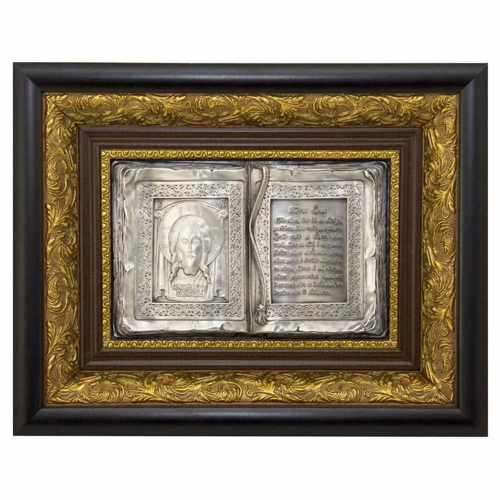 Подарок «Спас с молитвой» выполнен в виде раскрытой книги с изображением Иисуса Спасителя и молитвой «Отче наш» на второй странице. Данная икона будет отличным подарком для ваших родных и близких, ведь она помогает справиться со многими болезнями, защищает от внешнего влияния на человека. Также считается, что молитва Спасу может помочь в улучшении материального положения или в поиске работы. Подарок вылит из меди и покрыт серебром. Дополнительное покрытие выполнено патинирующим составом и воском. Икона обрамлена деревянным багетом и защищена плотным стеклом.