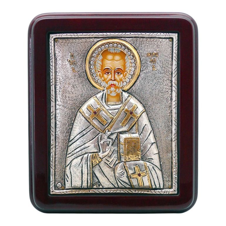 Икона «Святой Николай» производства греческой марки Argiropoulos считается чудотворной и очень востребована среди верующих православных христиан. Эта икона изготовлена на основе твердого полиэстера, который покрыт настоящим серебром 999 пробы и позолотой. Также икона посеребрена и инкрустирована кристаллами и камнями от известного ТМ Swarovski.