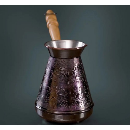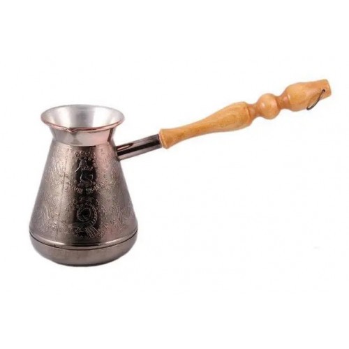 Чеканка, толщина меди 1мм, внутри покрыта пищевым оловом толщиной 9-12мкм, внешне покрыта термостойким никелем. Медь обладает равномерной теплопроводностью, а сама турка имеет самое узкое горлышко, что для приготовления кофе немаловажно. Медная турка имеет специальное внутреннее покрытие из пищевого олова. Медные турки лучше подчеркивают вкус и аромат кофе, а также позволяют распределить тепло равномерно по всей поверхности сосуда, избавив кофе от подгорелого привкуса.