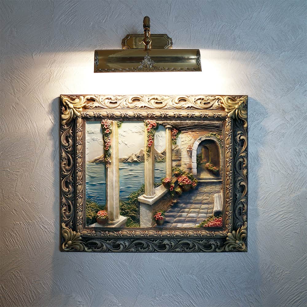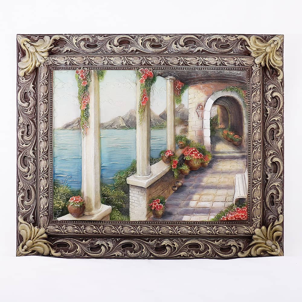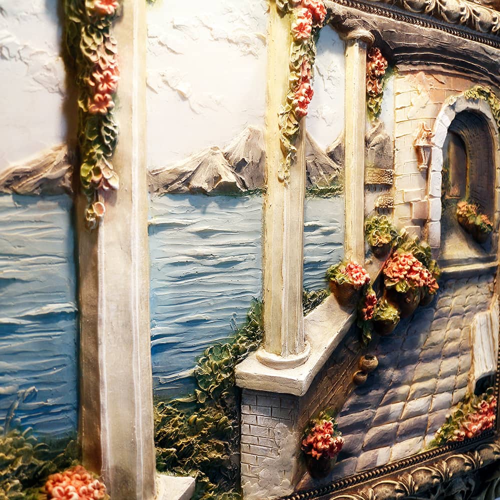 Цветная картина ручной работы «Итальянский дворик» изготовлена из полирезины и камня. Эта объемная картина небольшого размера (52*62 см) станет украшением домашнего очага.