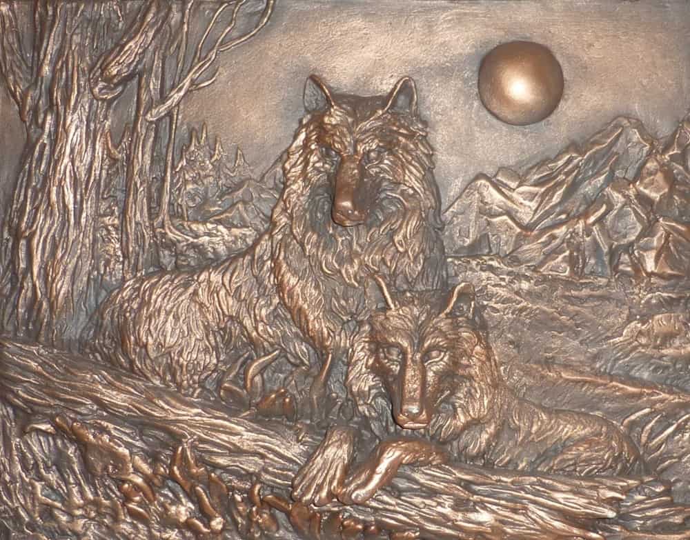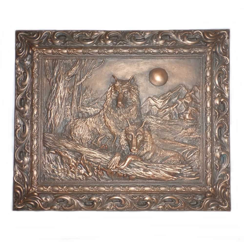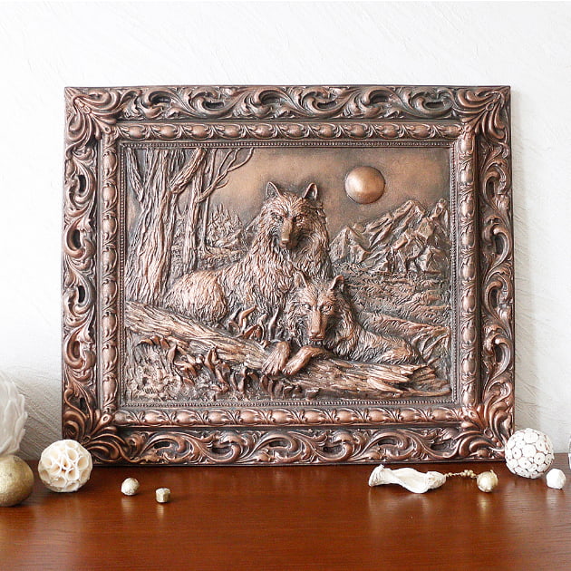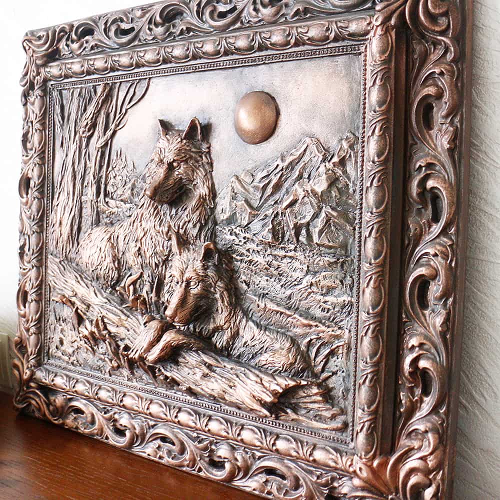 Картина рельефная медь «Пара волков» изготовлена из качественного полимерного материала с добавлением каменной крошки. Рама барельефа имеет размеры 52*62 см и вытянута по горизонтали. Картина окрашена в медный цвет, что придает ей своеобразный стиль, который подчеркнет характер владельцев дома.