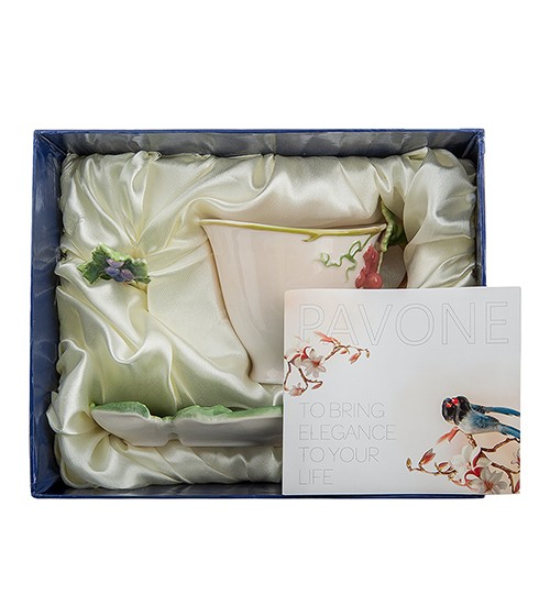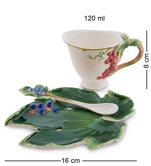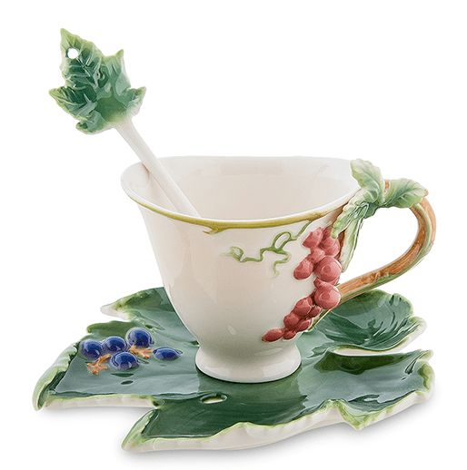 Перше, що вражає при погляді цього унікального виріб — неймовірна тонкість роботи художників. Виноградний лист, у вигляді якого виконано блюдце, наче щойно зірвано у винограднику. Насичений зелений колір, характерні тонкі прожилки, майстерно створена форма - блюдце вражає своєю красою. І, перебуваючи в повній гармонії зі блюдцем, другу частину пари є чашкою з орнаментом у вигляді соковитого виноградного грона.