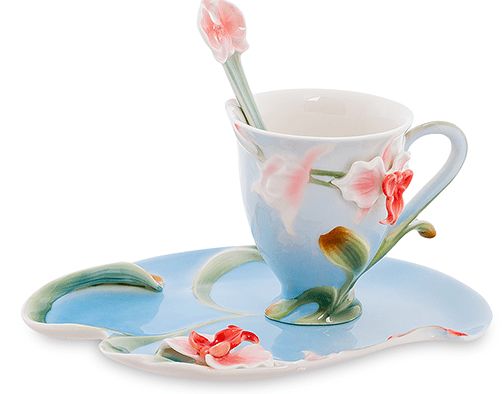 Ніжні, витончені орхідеї на блюдце, чашці та ложці створюють ідеальне поєднання, вони чудово доповнюють один одного. Саме ці напрочуд гарні квіти є родзинкою кавової пари «Орхідеї».
