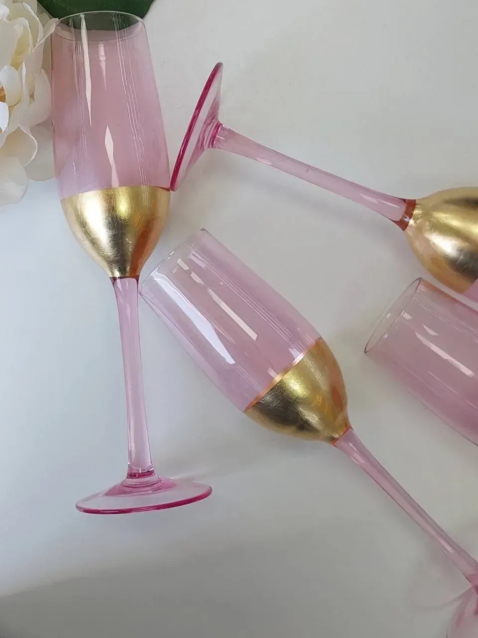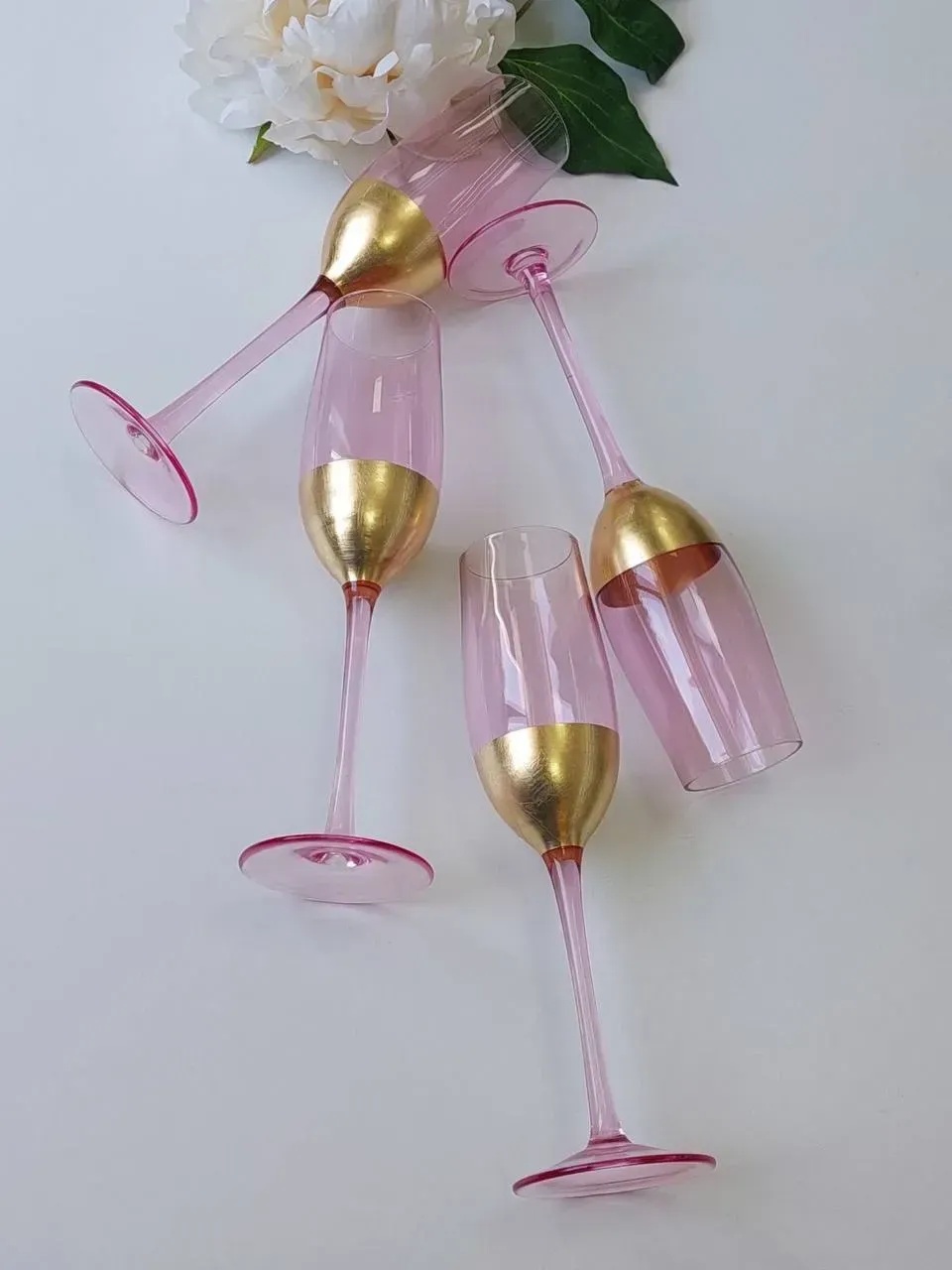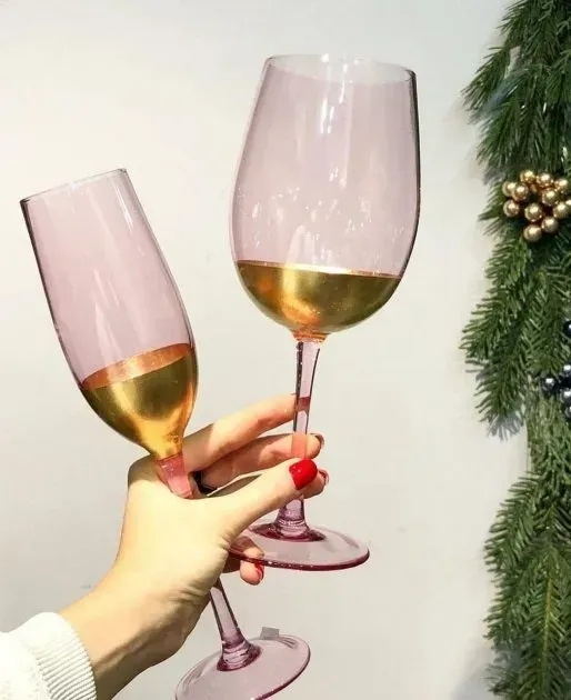 Кожен келих та склянка з цієї серії — не просто посуд, а акцент, який створює атмосферу затишку й стилю. Напівпрозоре рожеве скло з ніжним золотистим відтінком виглядає вишукано та стримано. Світло красиво відбивається від стінок, підкреслюючи колір напою.