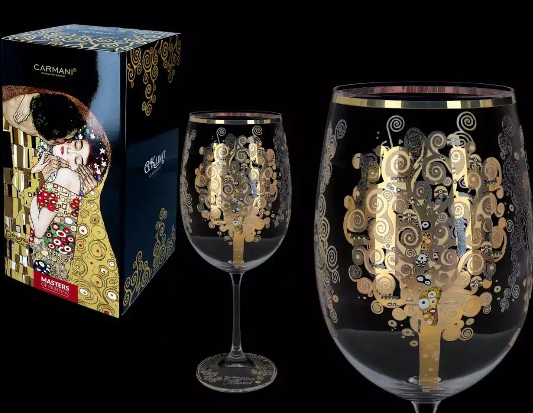 Скляний бокал для вина "Дерево життя" від Carmani об’ємом 640 мл поєднує класичну форму та сучасний художній декор. Його дизайн натхненний роботою Густава Клімта й виконаний у характерній стилістиці модерну. Такий бокал підходить як для щоденного користування, так і для сервірування святкового столу.