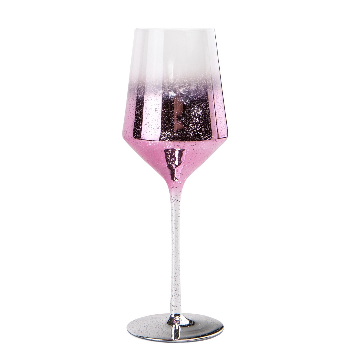 Келих для вина скляний кольоровий Нефрит — це стильне рішення для тих, хто цінує ефектну подачу та оригінальний дизайн. Градієнтне поєднання рожевого та сріблястого з блискітками надає келиху святкового настрою і виділяє його серед інших.