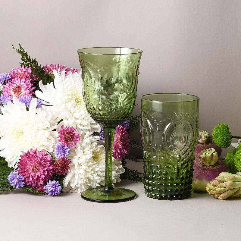 Яскрава палітра включає насичені кольори — зелений, синій, бурштиновий та пурпуровий — кожен з яких піднімає настрій і чудово поєднується з будь-якими стравами. Келихи стійкі, зручні у використанні, підходять для подачі вина, води, коктейлів і святкових напоїв.
