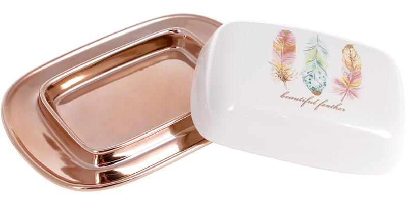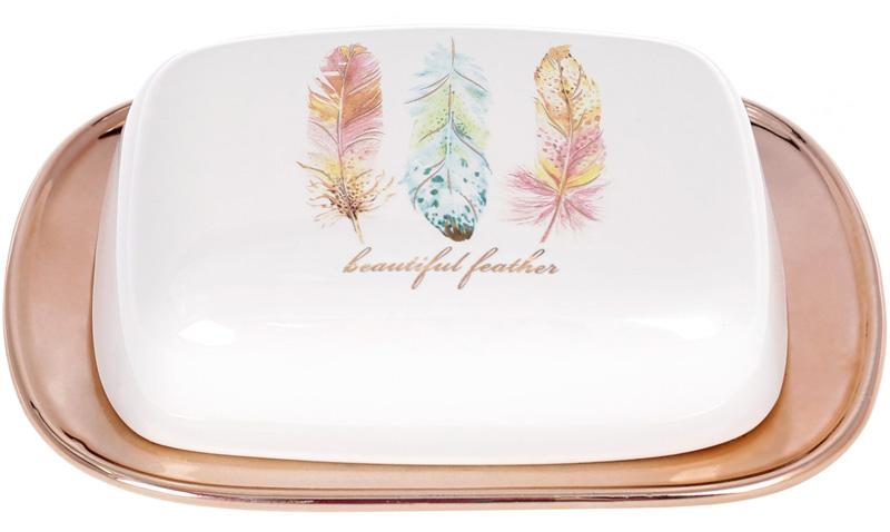 Маслюка Плюмаж Перо жар-птиці. Біла кераміка з декором - кольорове пір'я Жар-птиці. Блюдце у золотистому кольорі, поєднується з малюнком на кришці. Розмір: 18.5х12.5х5.5см. Запакована в подарункову коробку.