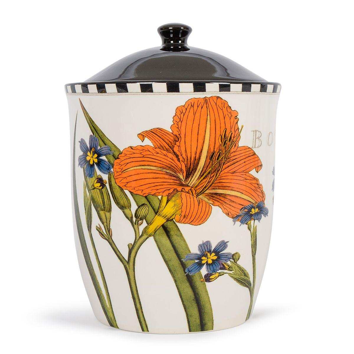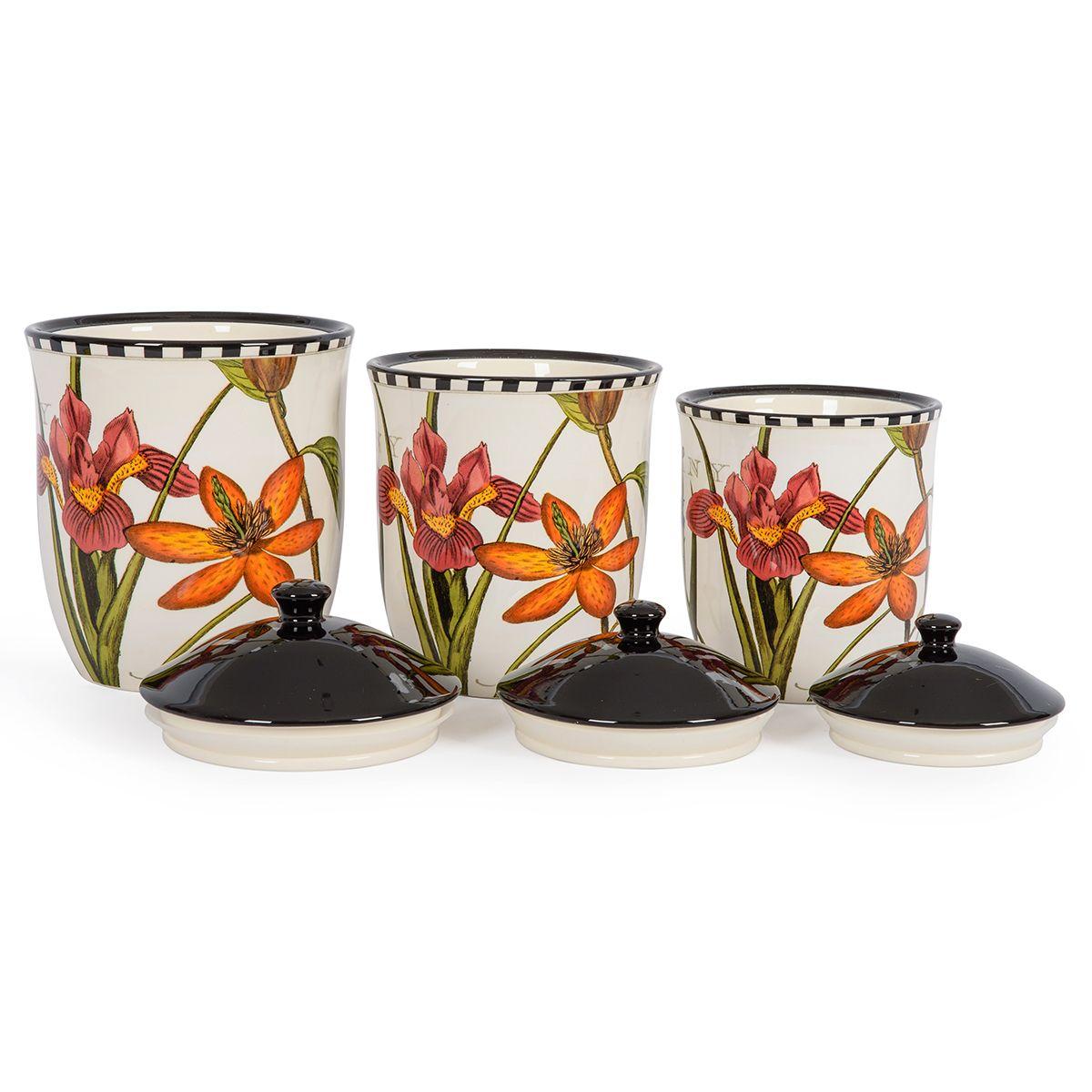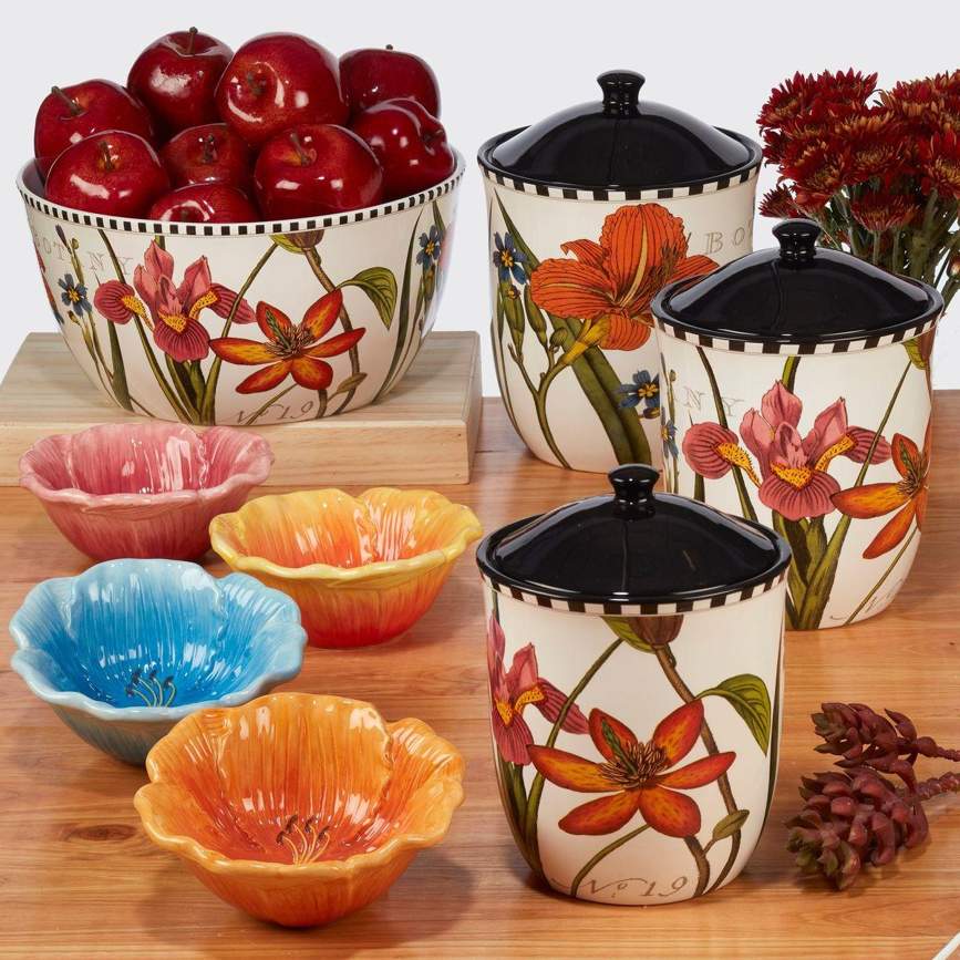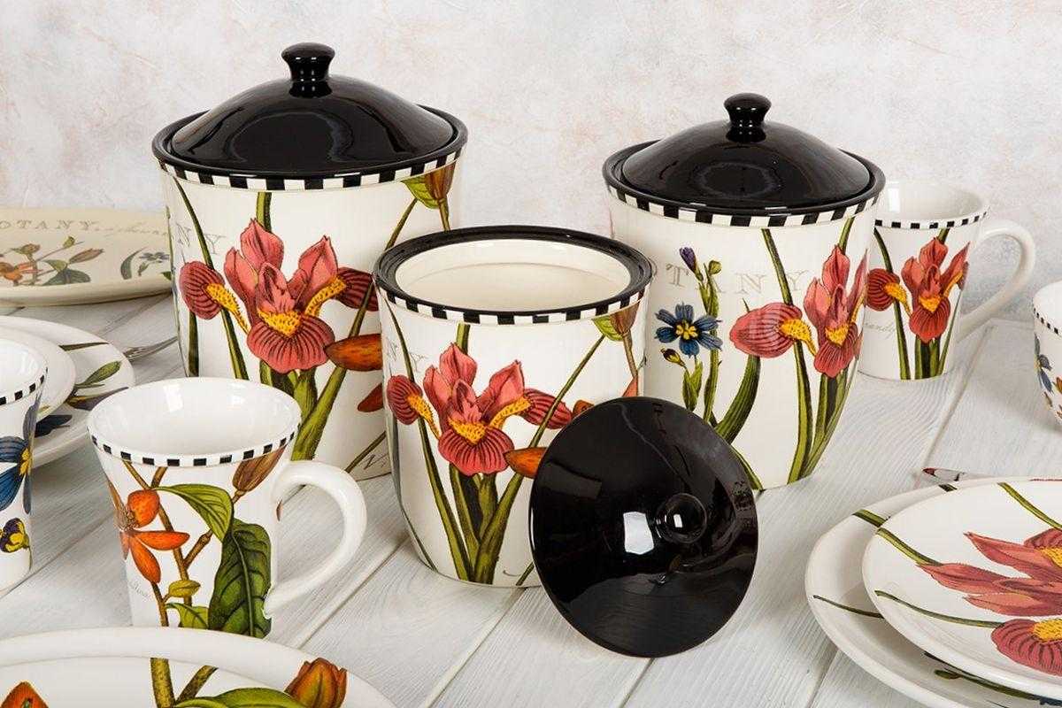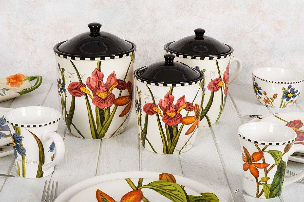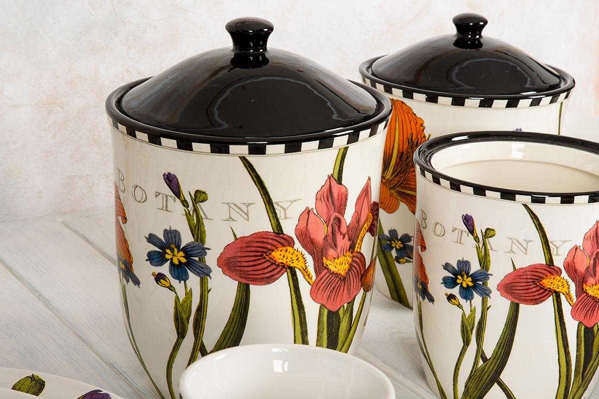 Красивые садовые цветы насыщенных теплых оттенков украсили набор емкостей для хранения разных размеров. Яркий дизайн с рисунком садовых растений и номерами, как в справочнике по ботанике, разработан известной американской художницей Сью Шлабах. Каждую емкость украшают разные цветочные композиции, а черные герметичные крышки в сочетании с полосатой каймой, добавляют нотку элегантности набору, который несомненно станет ярким акцентом современной кухни в минималистическом стиле или с элементами контемпорари.
