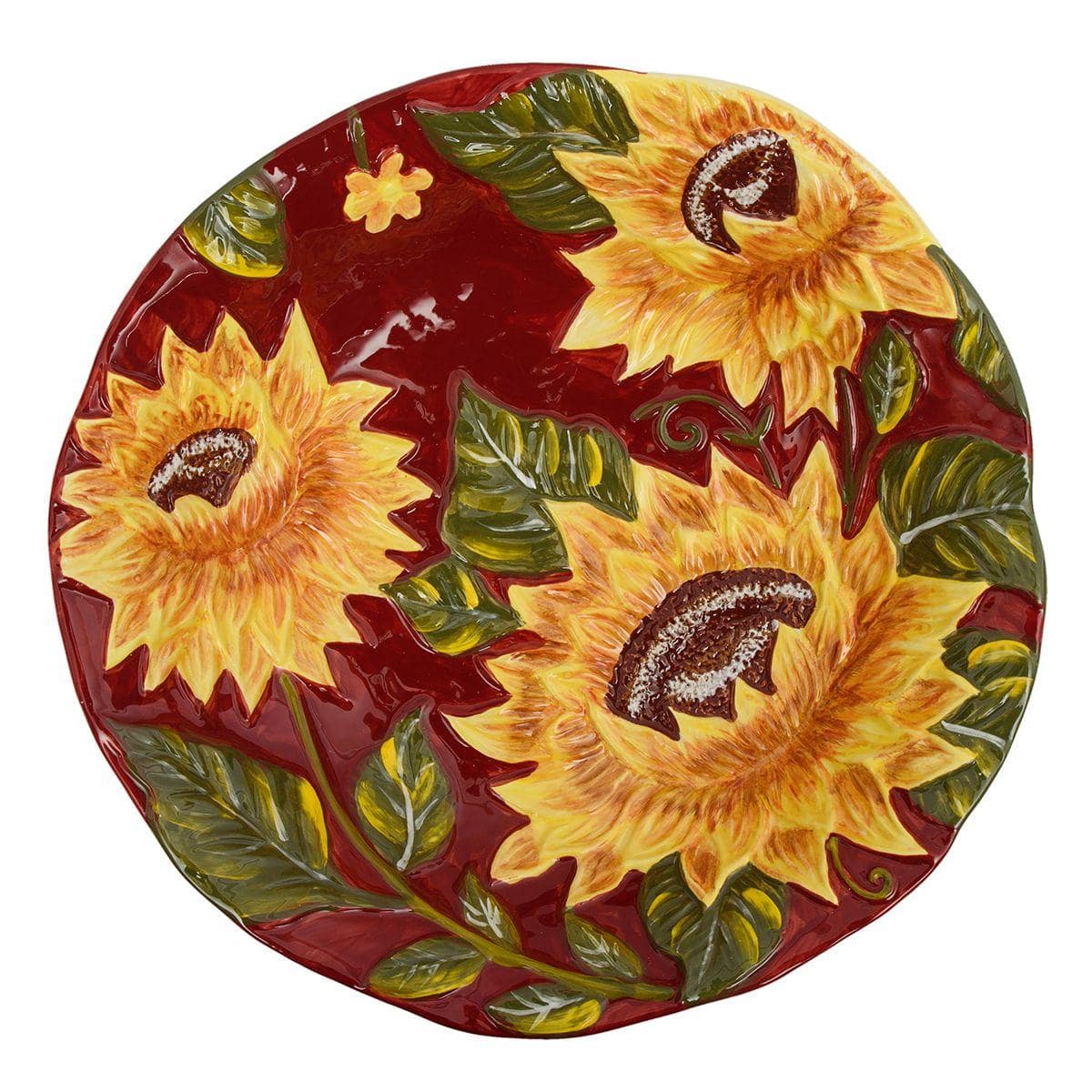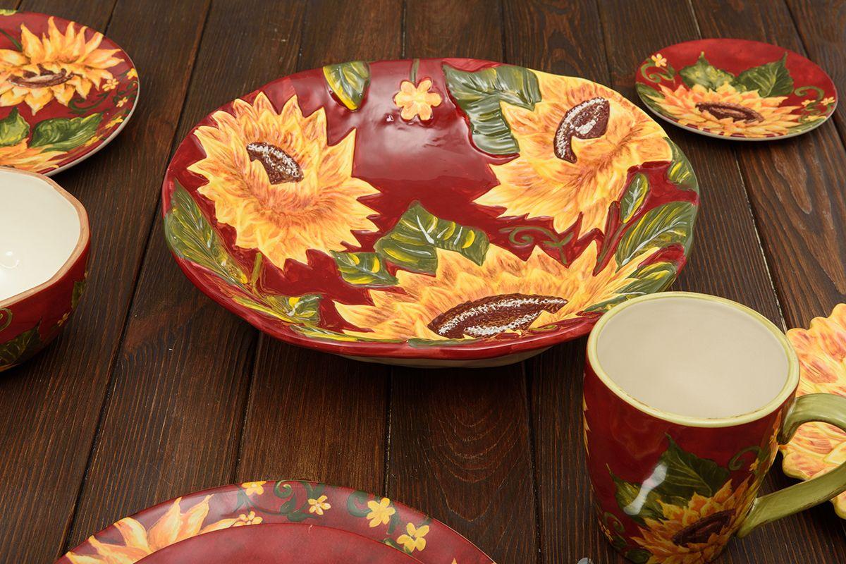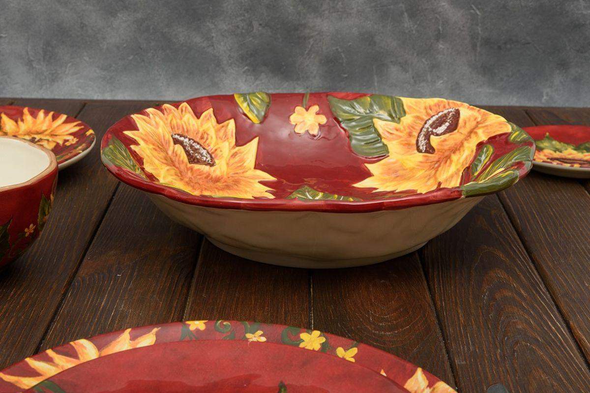 Красивый рельефный узор в виде подсолнухов на фоне красного закатного неба украсил миску с неровными краями и поверхностью, которые придают изделию колорит аутентичной керамики, созданной по технике майолика. Глянцевая износостойкая глазурь, нанесенная поверх красочного рисунка, придает салатнику роскошный блеск.