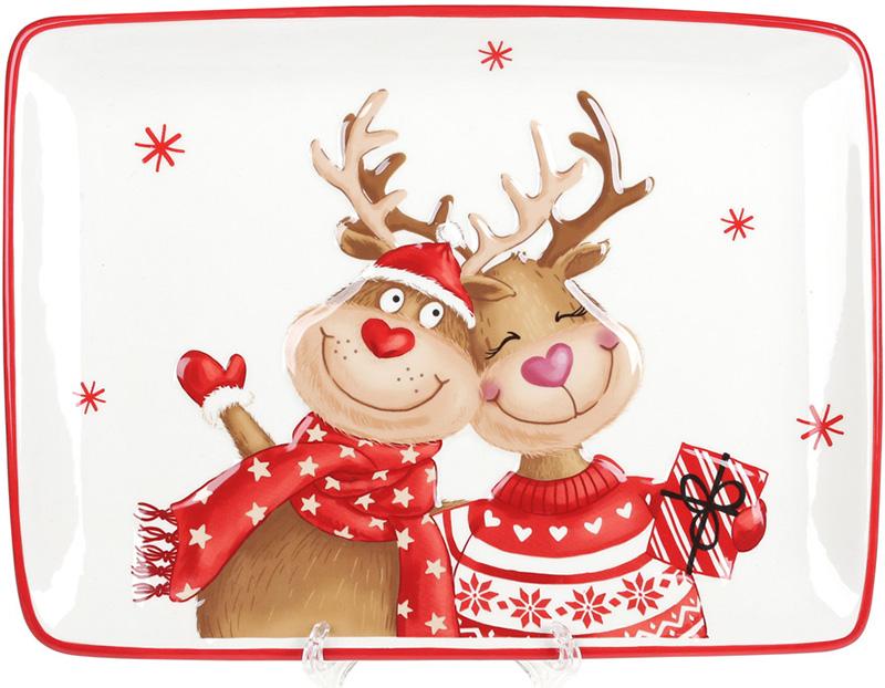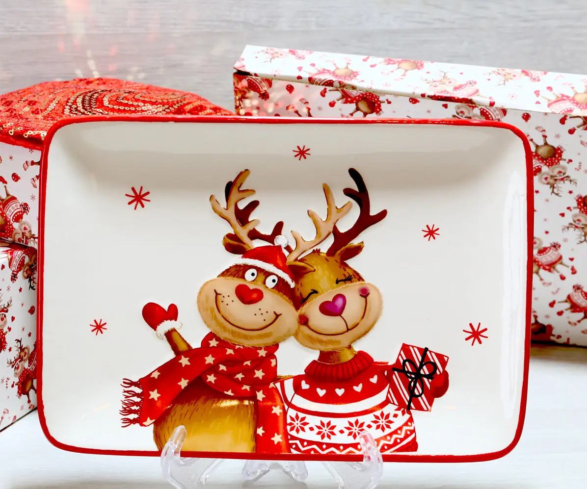 Керамическое новогоднее блюдо прямоугольное Веселые олени 31х22 см