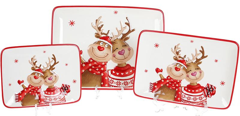 Коллекция керамической посуды с объемным рисунком для создания рождественского настроения на Вашем столе. Белая керамика с яркими красными деталями. Харизматическая парочка оленей в зимней одежде и с подарком подарит веселое настроение всем гостям за праздничным столом.