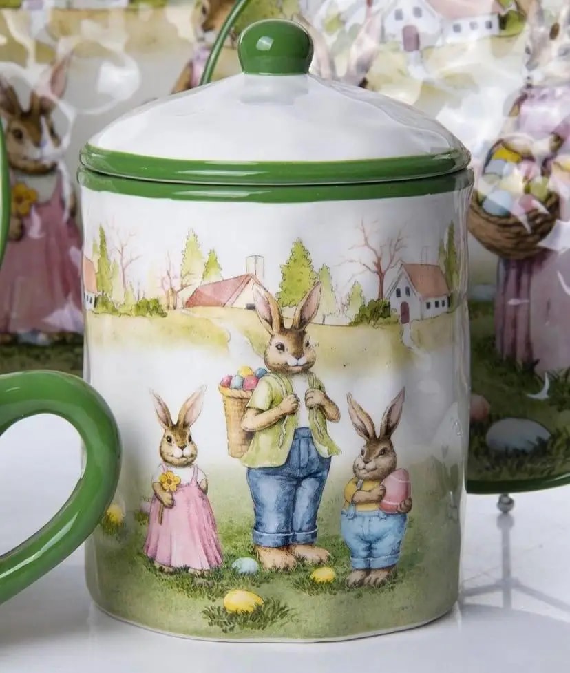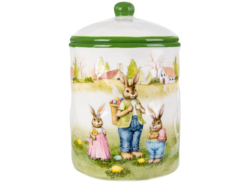Керамічна банка для зберігання «Великодній Кролик» об’ємом 1,8 л — це не лише практичний аксесуар для кухні, а й стильний сезонний елемент декору. На поверхні зображена мила сцена з кроликами у святковому вбранні на тлі весняного пейзажу з зеленими луками та будиночками. Яскраві кольори та деталізований малюнок створюють по-справжньому радісний настрій і чудово пасують до атмосфери Великодня та весни.