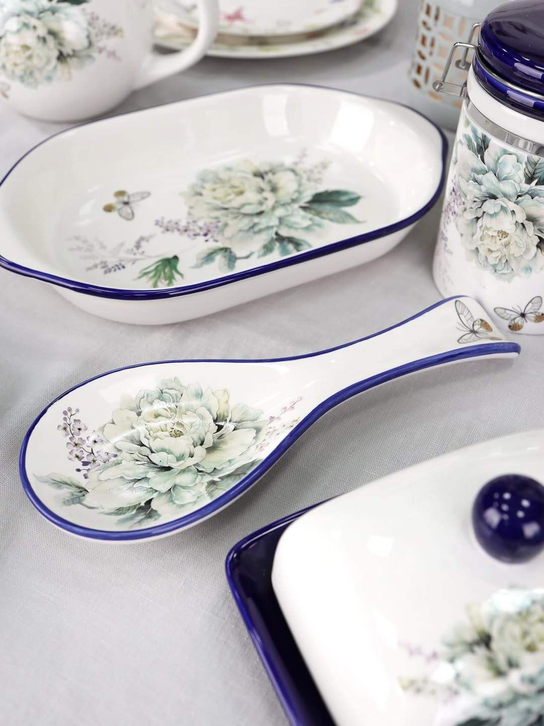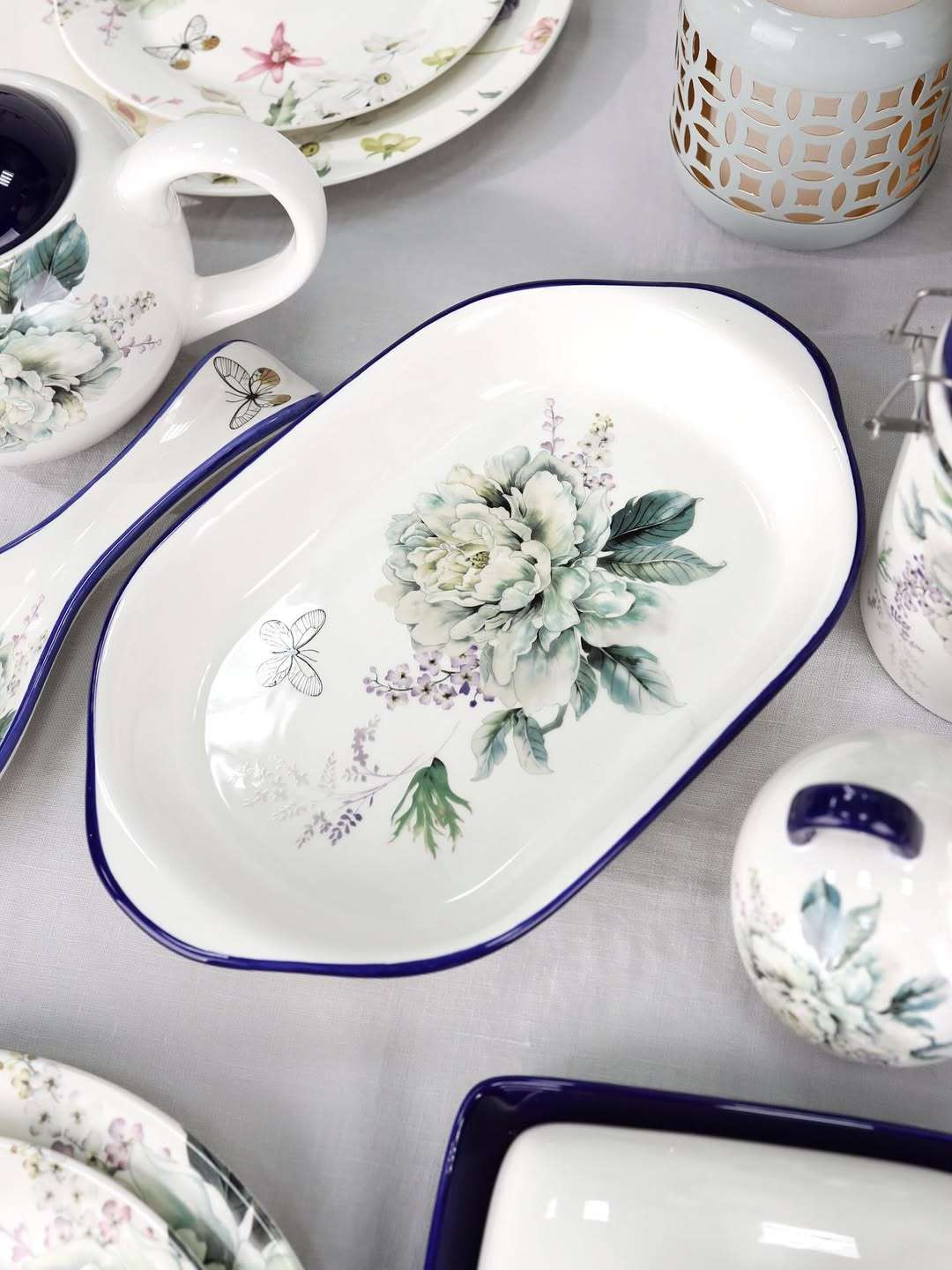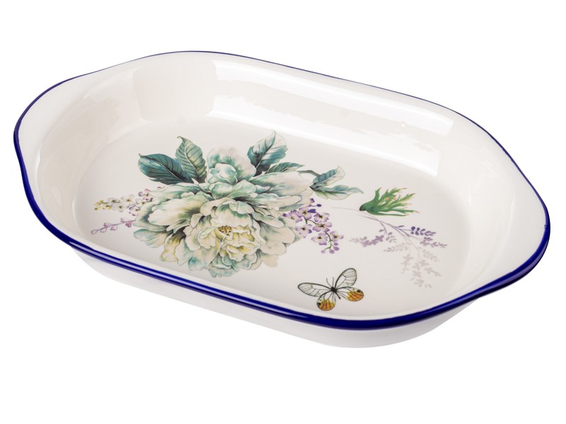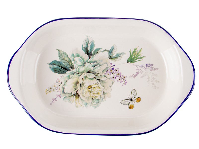 Вишукане блюдо для запікання “Флер” довжиною 29 см — це ідеальне поєднання краси та практичності. Білосніжна поверхня прикрашена великим квітковим візерунком у ніжних пастельних тонах та доповнена витонченою бабкою. Синій кант по краю додає виразності та елегантності. Таке блюдо легко впишеться як у класичний інтер’єр, так і в сучасну сервіровку, стаючи справжньою окрасою столу.