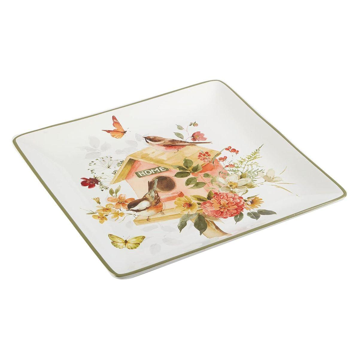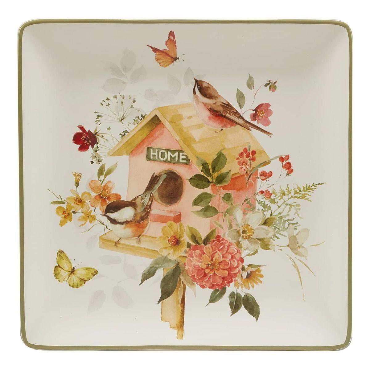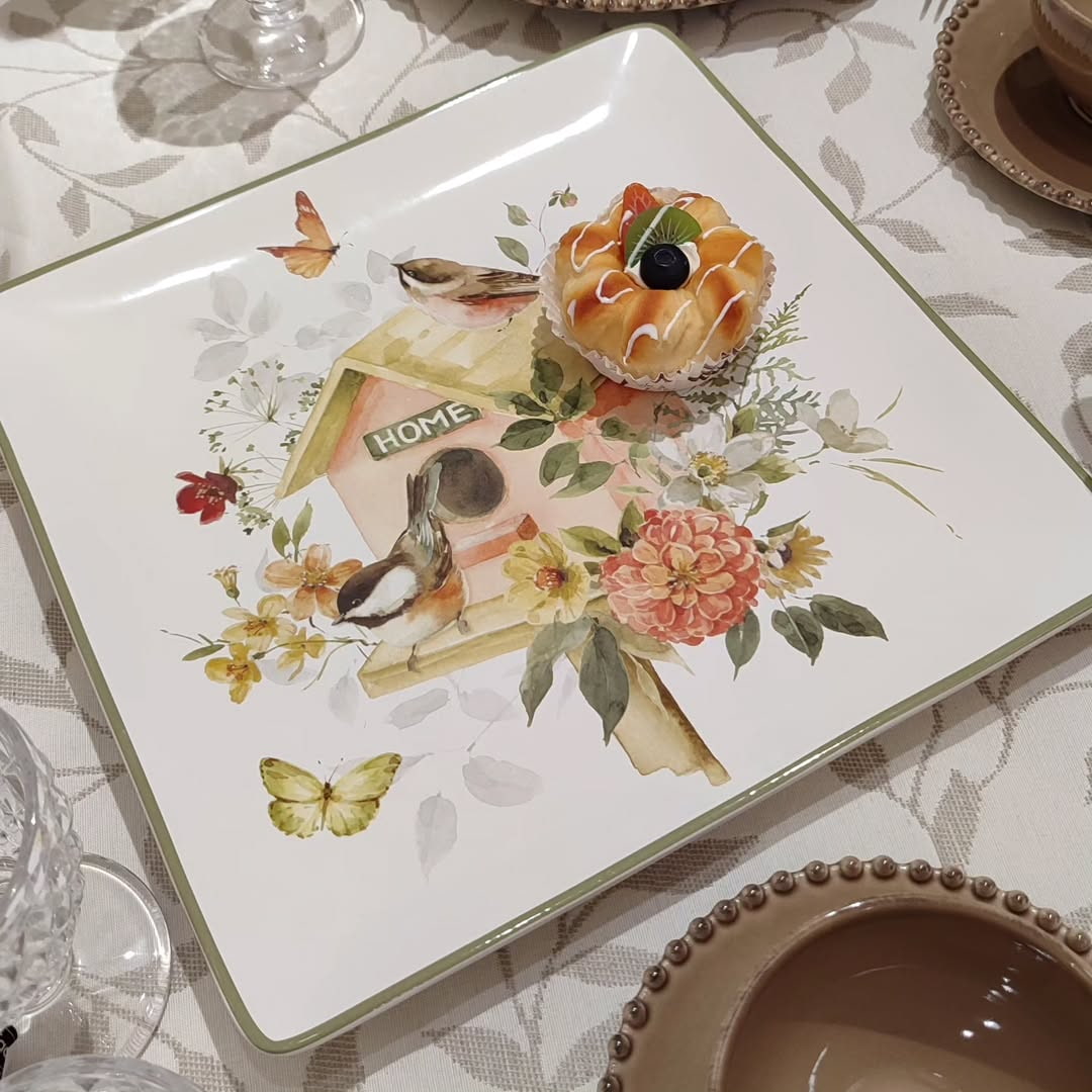 Квадратна форма та оливкове обрамлення надають страві вишуканого вигляду, а ніжний квітковий малюнок із затишною пташиною домівкою створює атмосферу тепла та гармонії. Блюдо ідеально підходить для сервірування столу, декоративного використання або як вишуканий подарунок.
