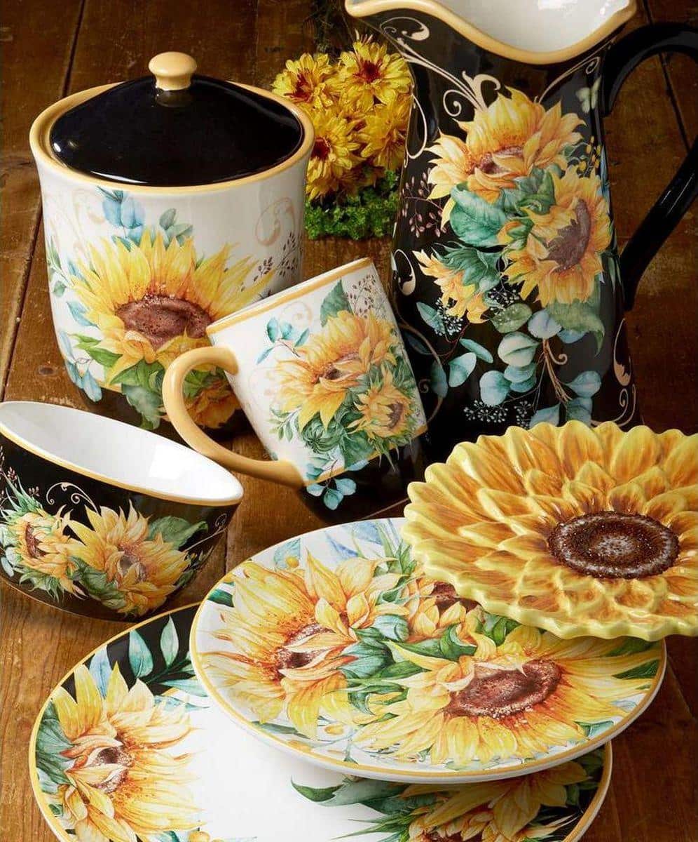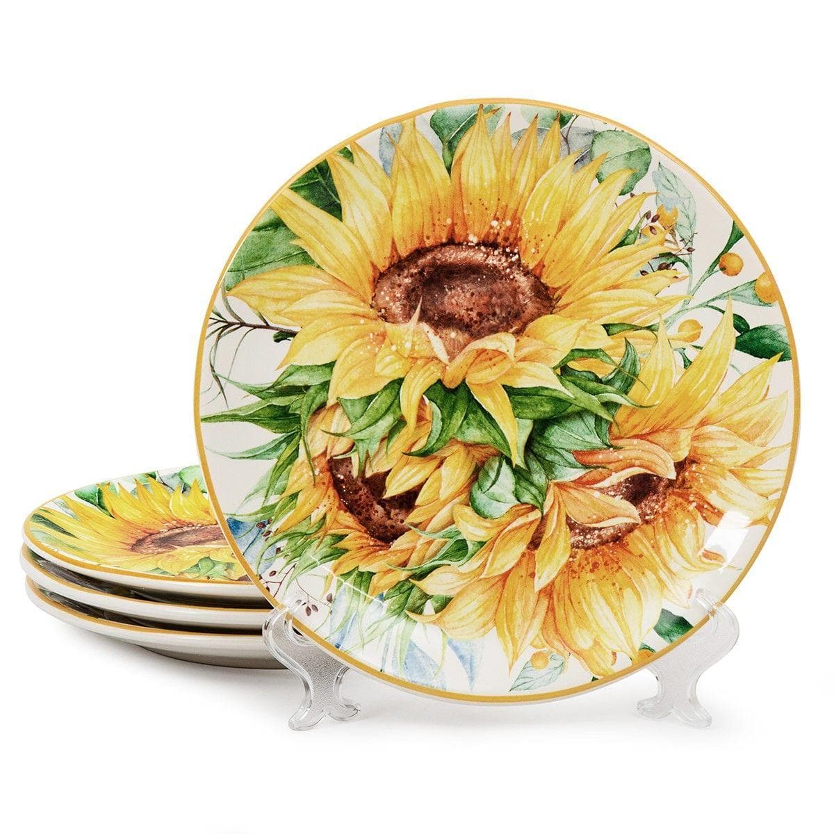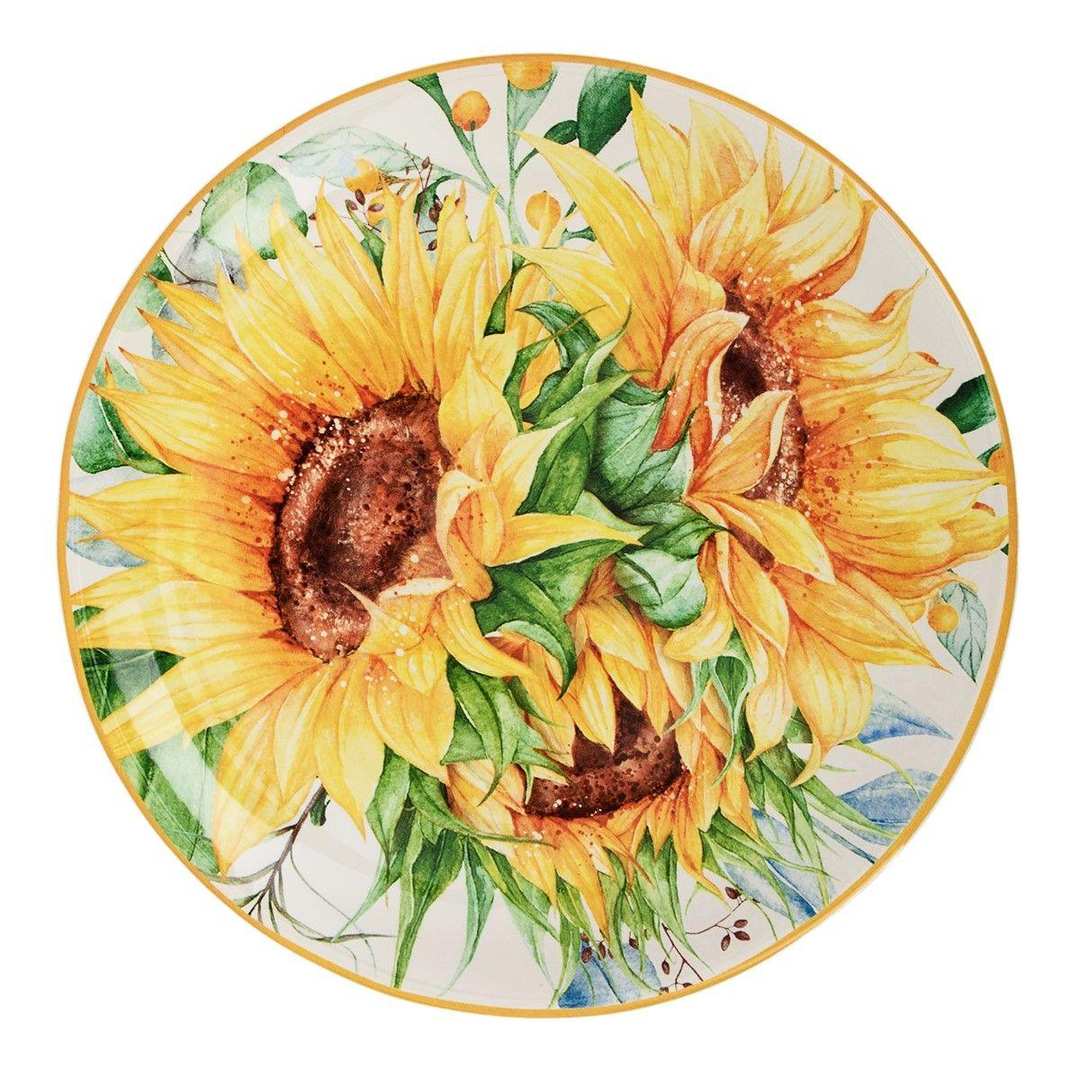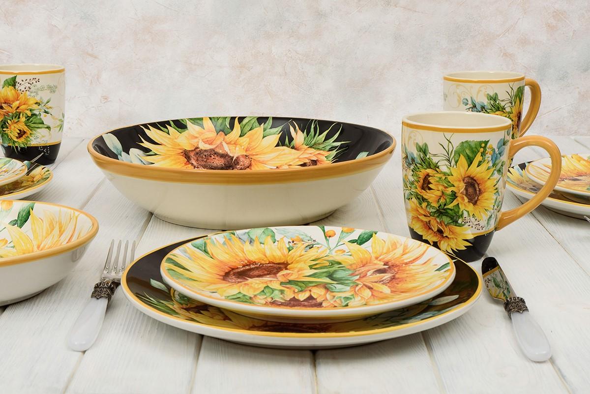 Салатні тарілки з нанесеною яскравою композицією із соняшників стануть акцентом у святковому та буденному сервіруванні обіду та вечері. Дизайн з букету соняшників, виконаний в акварельній техніці, створила відома художниця зі США Ненсі Мінк для компанії Certified International. До тарілок підійдуть келихи зеленого кольору, такі як Vista Alegre із рельєфним візерунком. Набір може стати чудовим подарунком до будь-якої урочистості.