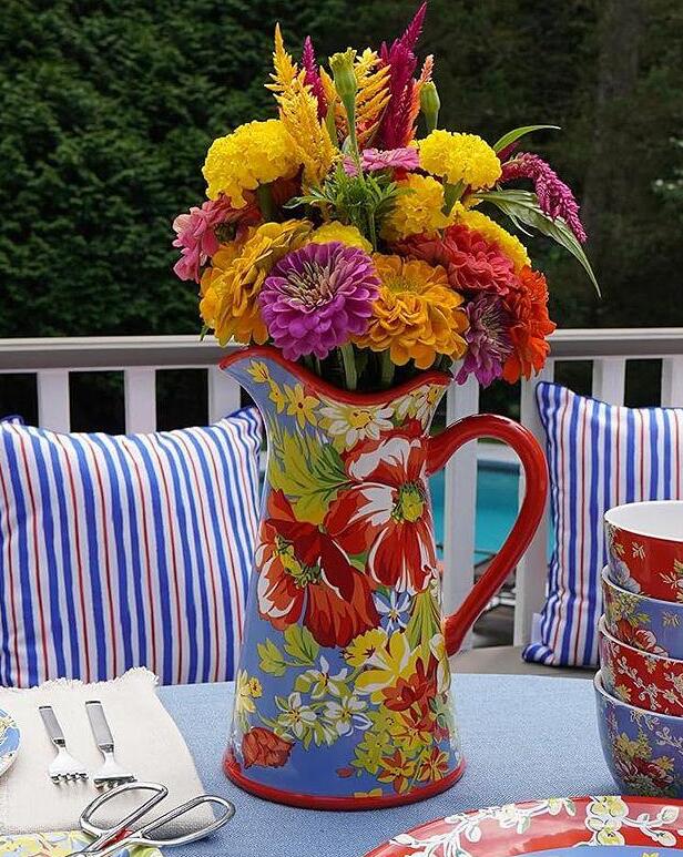 Керамічний глечик з червоним обідком "Феєрія квітів" від Certified International – це яскравий акцент на вашому столі, що поєднує стиль, функціональність і витончену естетику. Барвистий квітковий візерунок, ручний розпис і вишукані деталі роблять його не просто посудом, а справжнім витвором мистецтва. Глечик можна використовувати для подачі води, лимонаду, соку, молока або як стильну вазу для квітів.