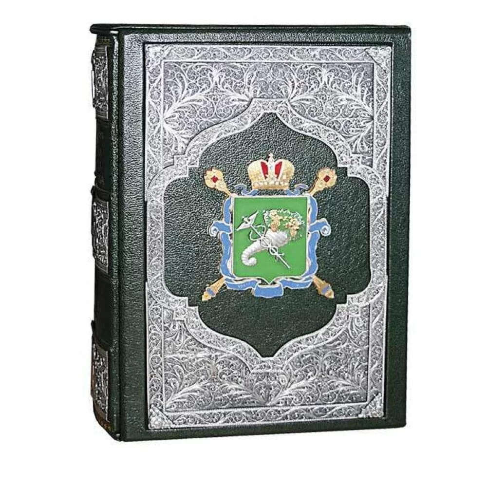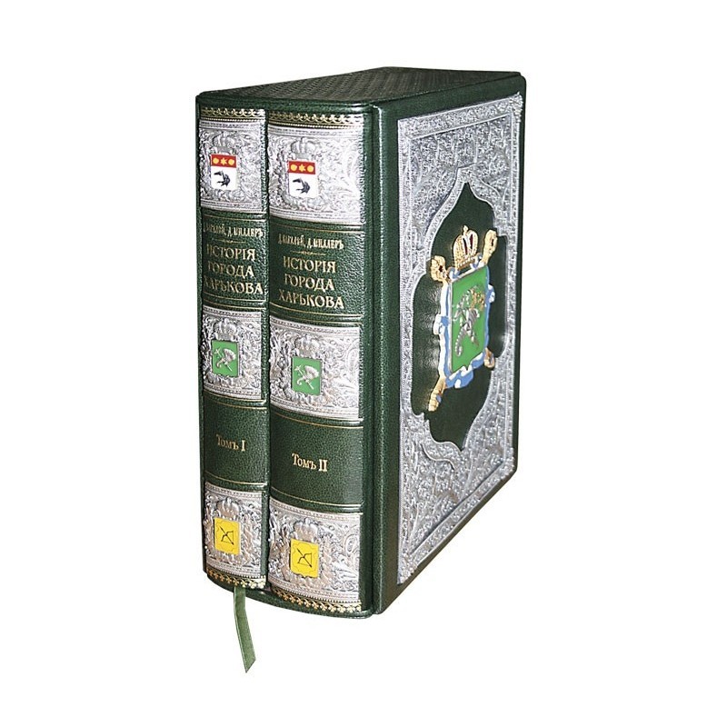 Подарункова, колекційна книга виконана в розкішній цільношкіряній палітурці ручної роботи та мідними накладками з позолотою, сріблом, тканиною, емалями.