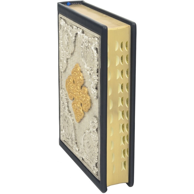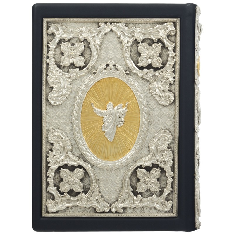 Роскошный цельнокожаный переплёт ручной работы и медными накладками с позолотой, серебрением, сканью, эмалями.