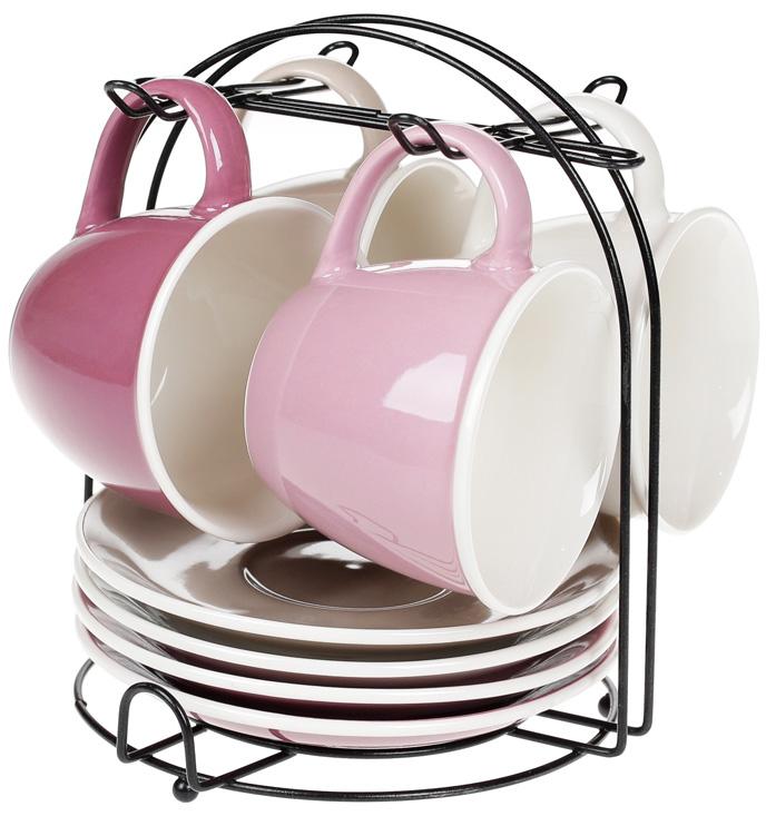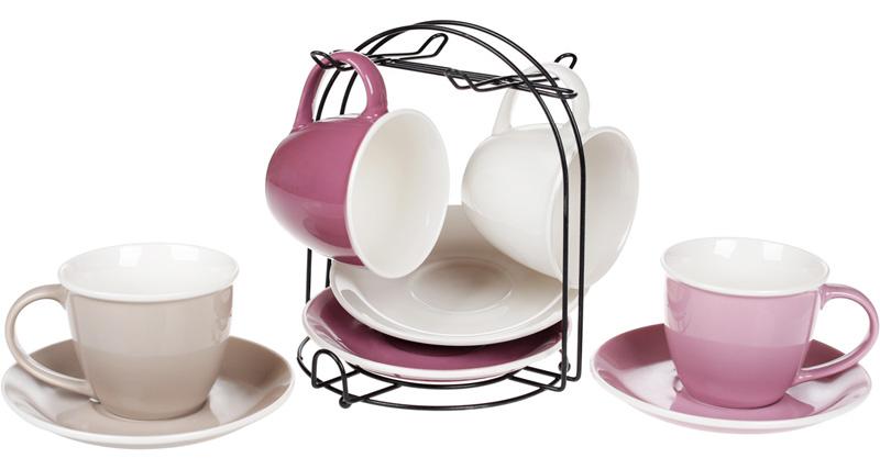 Размер 1 кружки: 8.7х7см, диаметр блюдца: 14.5см. Металлическая подставка для сушки и хранения.