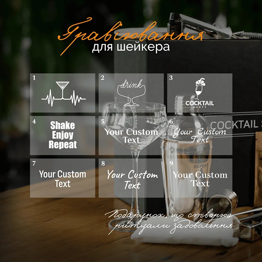 — Індивідуальне гравіювання: без гравіювання / на шейкері / на склянках / на сталевих кубиках / у різних комбінація