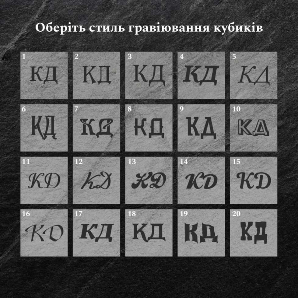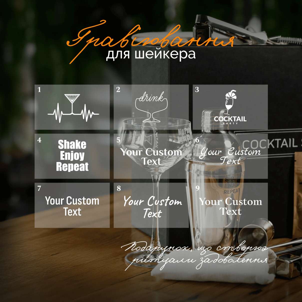 — Індивідуальне гравіювання: без гравіювання / на шейкері / на склянках / на сталевих кубиках / у різних комбінаціях