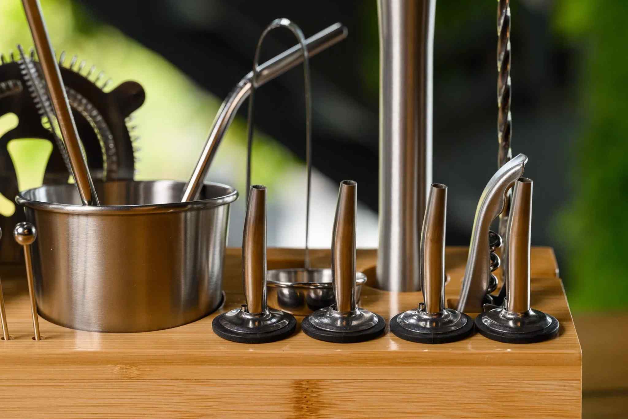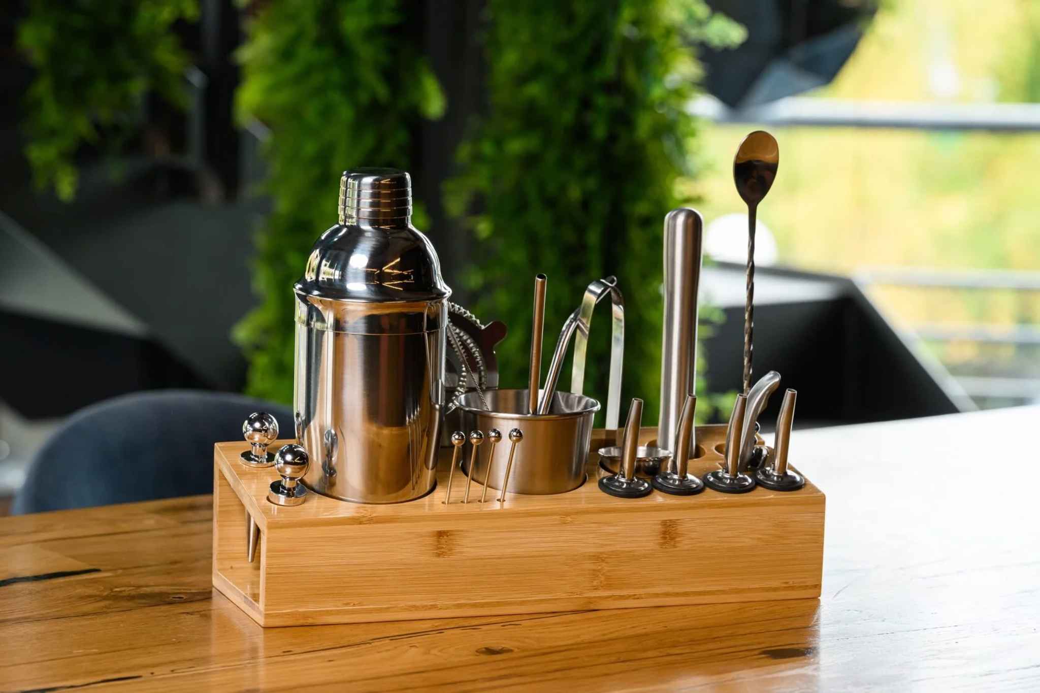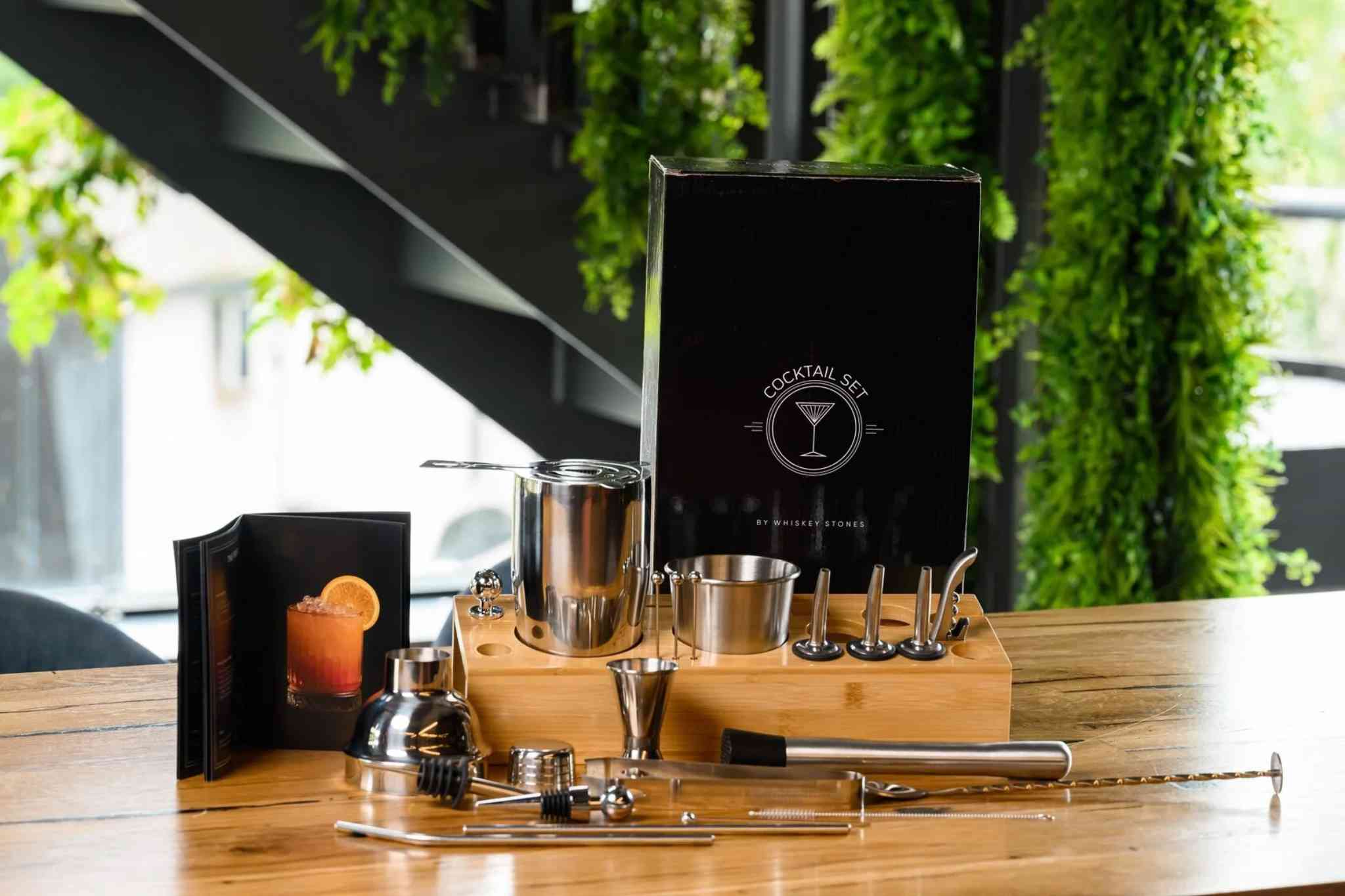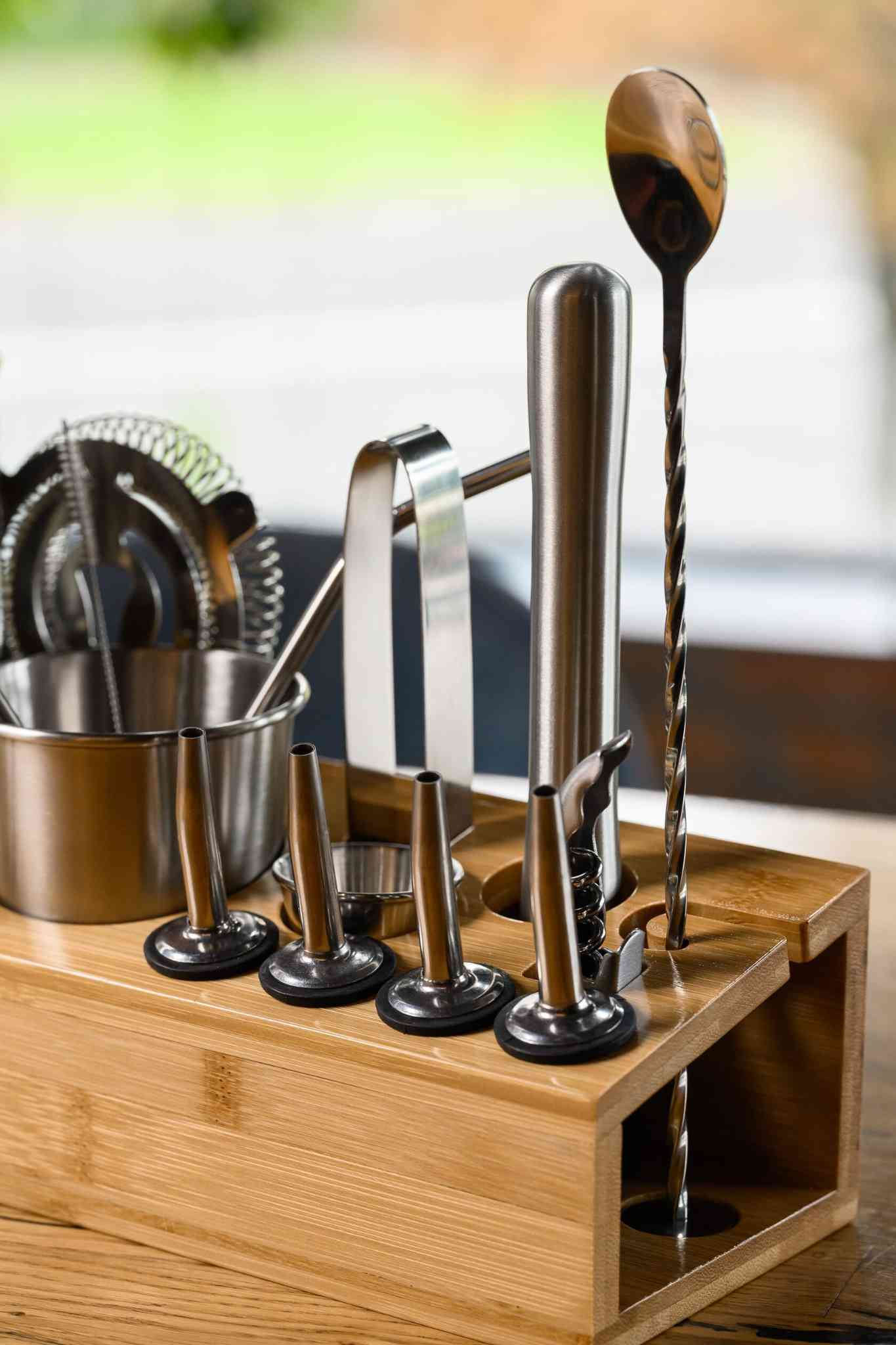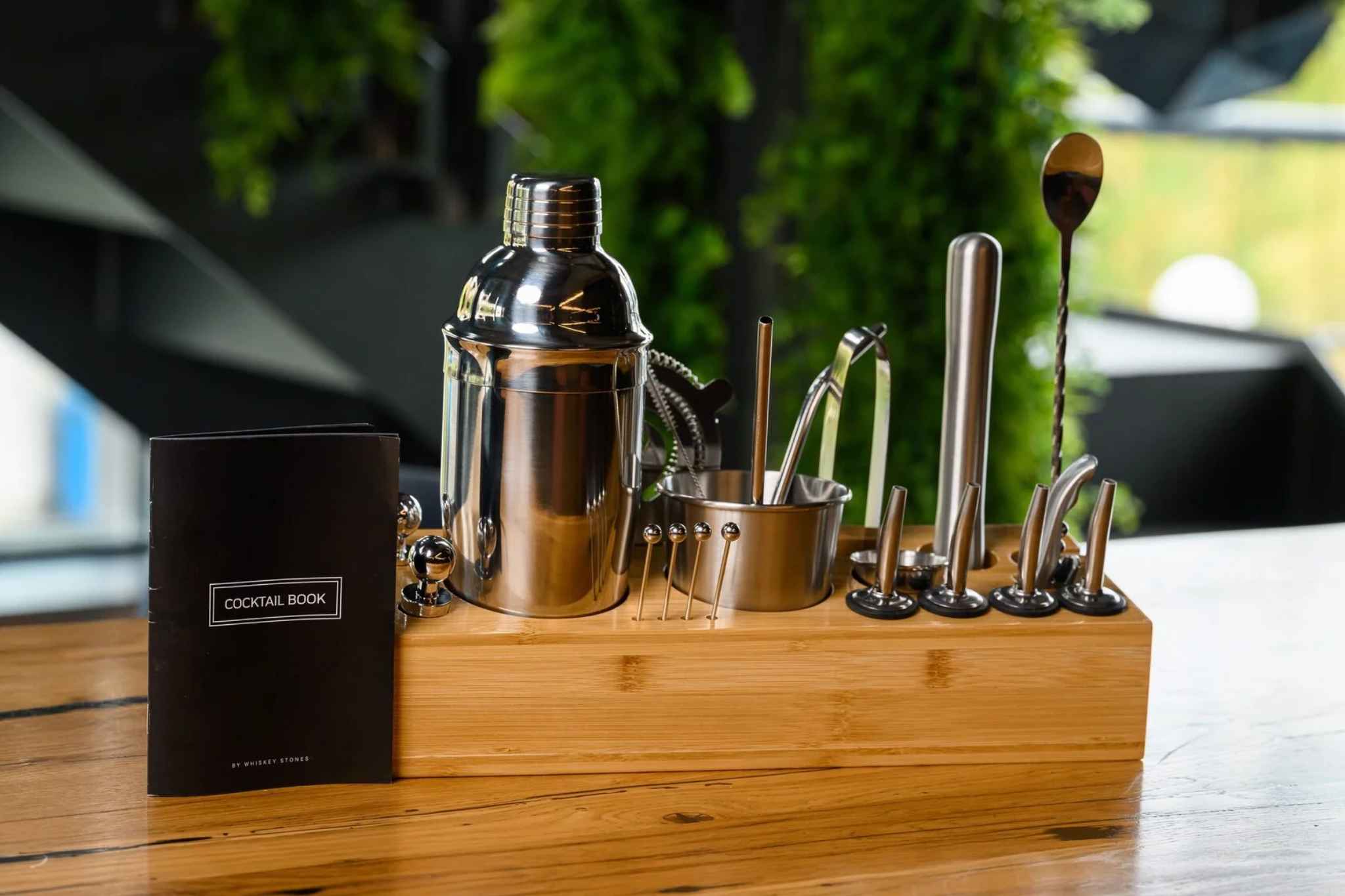 Функціональний та продуманий набір аксесуарів для приготування коктейлів стане надійним помічником для тих, хто любить створювати барні напої вдома. З цим комплектом процес змішування коктейлів стає швидким, зручним і зрозумілим, адже всі необхідні інструменти вже зібрані в одному наборі. Елегантна дерев’яна підставка додає естетики та гармонійно доповнює інтер’єр домашнього бару.