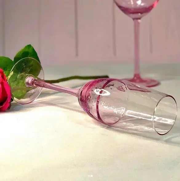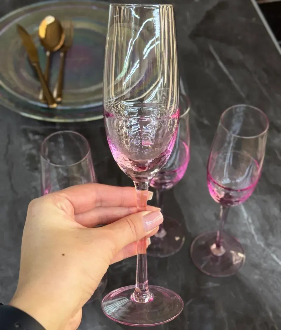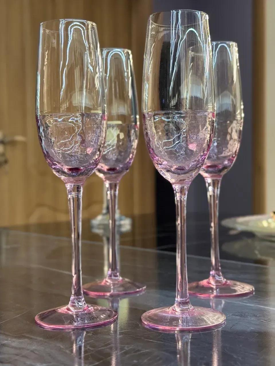 Його вишукана форма чудово розкриває смак ігристих напоїв, а напівпрозоре рожеве скло створює особливий настрій, що підкреслює стиль та увагу до деталей. Цей келих одразу привертає увагу та додає сервіруванню столу витонченого вигляду та унікальності.