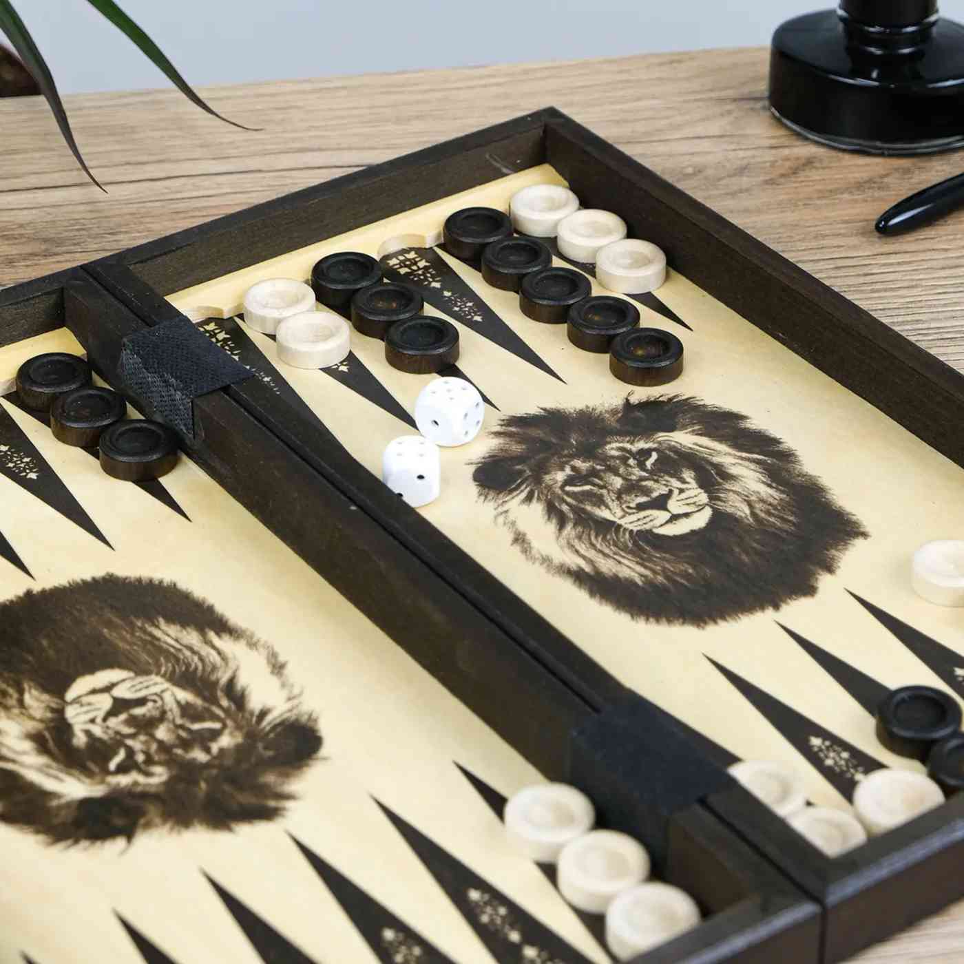 Дерев’яна дошка має виразний вигляд: розмітка клітин виконана випаленими лініями, а внутрішня частина, призначена для гри в нарди, прикрашена декоративним зображенням лева.
