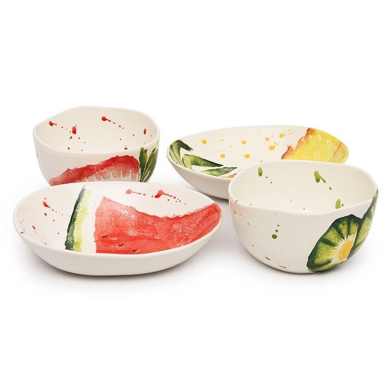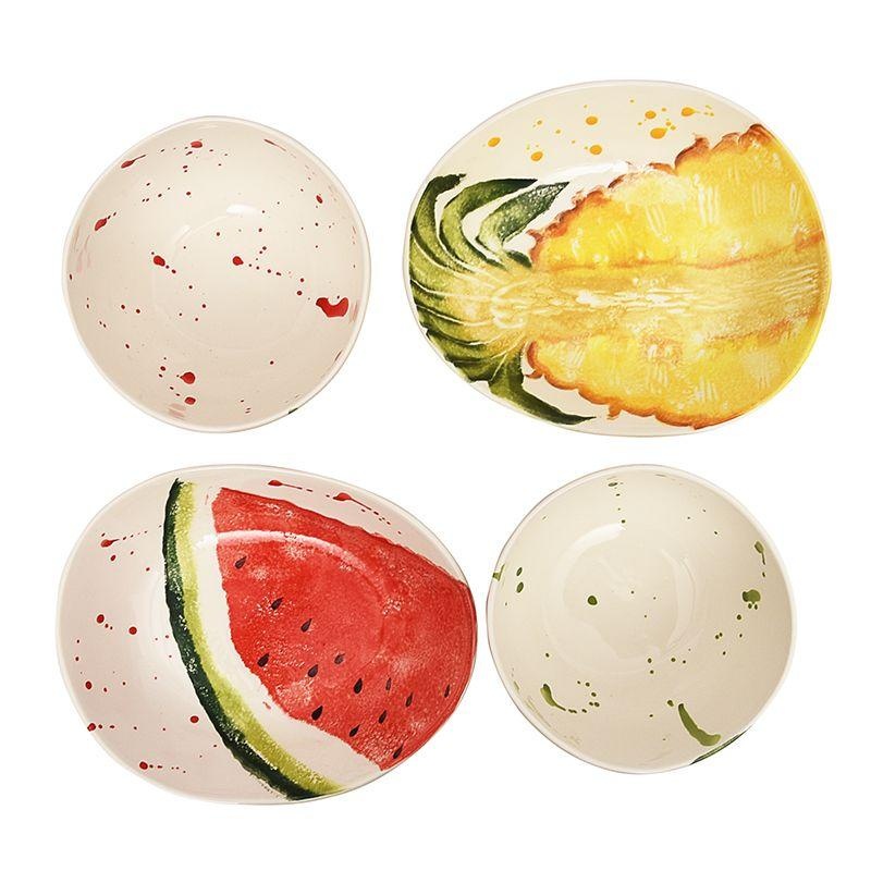 Набор из 4 предметов «Фруктовый коктейль» от Villa Grazia создан, чтобы добавить яркости и радости каждому приему пищи. В комплект входят 2 глубокие тарелки и 2 пиалы с изображениями ананаса, арбуза и киви — символами лета и свежести. Посуда выполнена из прочной керамики и украшена ручной росписью, что делает каждый элемент уникальным. Такой набор станет не только украшением стола, но и чудесным подарком для ценителей красивой сервировки. Сервируйте по-летнему — с Villa Grazia каждый день будет вкусным и солнечным!