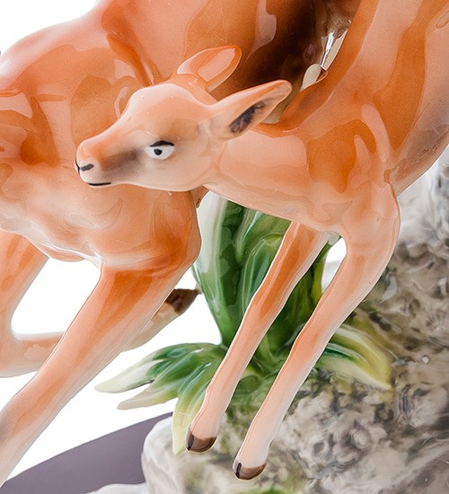 Тонкие и четко выраженные линии, гармоничность и экспрессия бега – все это очень хорошо передает композиция «Олени». Семья оленей запечатлена в момент опасности, спасаясь бегством, художнику удалось очень выразительно передать движение животных, подобрать мягкие цвета оформления, что без сомнения будет достойно оценено знатоками фарфора.