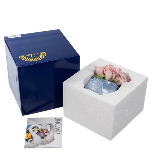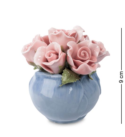 Ваза оригінальної форми, начебто складена з ніжних пелюсток синьої квітки, містить в собі букет класичних рожевого кольору квіток троянди із зеленими листочками. Трояндочки здаються живими - настільки тонкі пелюстки. Навіть не віриться, що вони виготовлені з порцеляни – наскільки високо майстерність художників, які створили цю композицію! Цей мініатюрний букетик гарний не тільки своєю ніжною красою, але й тим, що фарфорові квіти ніколи не зав'януть і навіть через роки збережуть цей дивовижний свіжий вигляд. Подаруйте живий букет троянд на знак щирого кохання та цю композицію – на довгу пам'ять!
