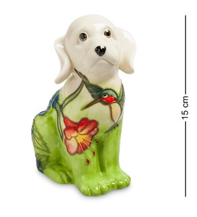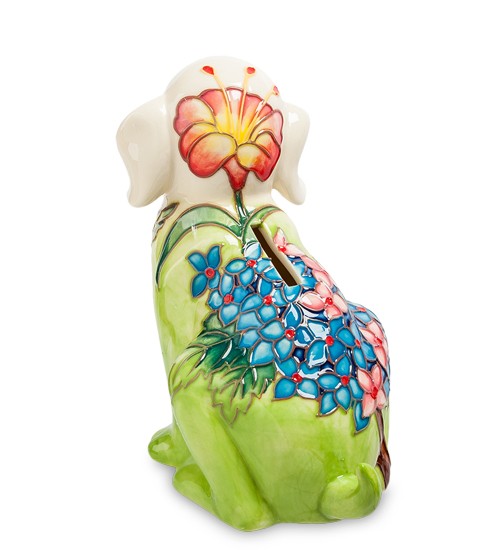 Копилка «Собака», сделанная из фарфора, поможет вам собрать необходимую сумму на крупную покупку и поможет украсить интерьер: при ее создании художники проявили фантазию, и раскра-сили четвероногого друга весьма необычным способом. У собаки белая голова, а тело покрыто ковром зелени. На груди собаки – маленькая птичка колибри, вьющаяся вокруг большого красного цветка. Собака преданно и жалобно смотрит вперед: киньте в нее монетку, и ей сразу станет веселее.