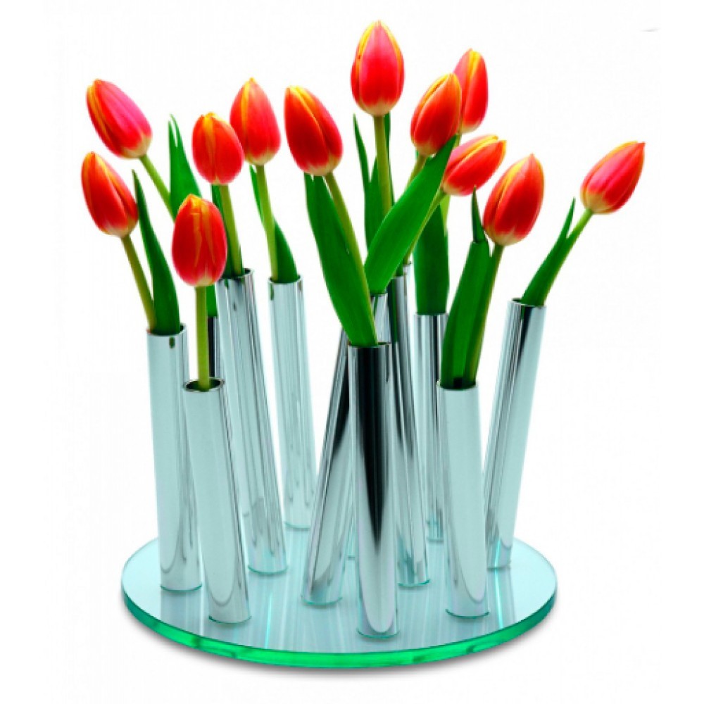Ваза"Букет" представляет собой оригинальный интерьерный аксессуар с нестандартным решением при размещении цветочной композиции, а так же замечательный подарок. Дизайнеры компании привнесли в свое изделие вдохновение от созерцания цветущего луга. Ваза изготовлена из зеркальной полированной нержавеющей стали на стеклянной основе и является ярким воплощением комнатной архитектуры и акцентом интерьера. Нестандартное решение и впечатляющий внешний вид вазы делает её прекрасным декоративным предметом для любого помещения в качестве самостоятельного декоративного объекта.