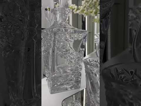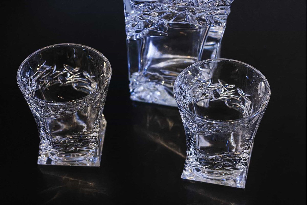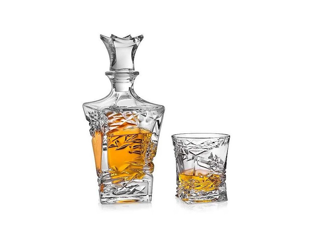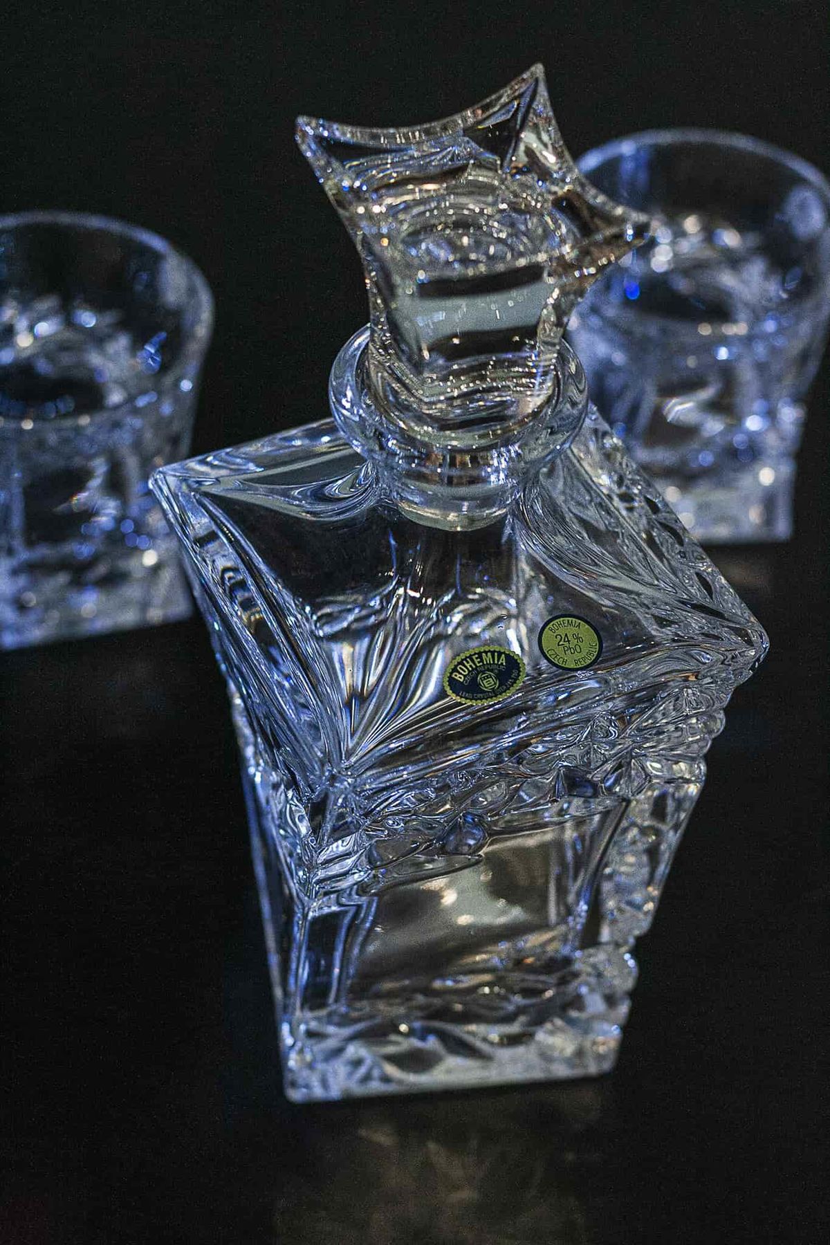 Із застосуванням точної алмазної обробки та традицій чеського склоробства створюються вироби з кришталю. Цей матеріал вирізняється високою прозорістю, виразним блиском і тонкістю виконання, а вироби при легкому дотику один до одного видають приємний, чистий дзвін. Штоф із кришталю гармонійно доповнить будь-який інтер’єр, підкреслюючи його елегантність і відчуття стриманої розкоші.
