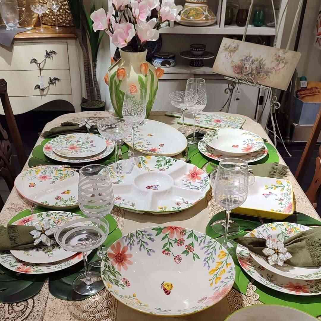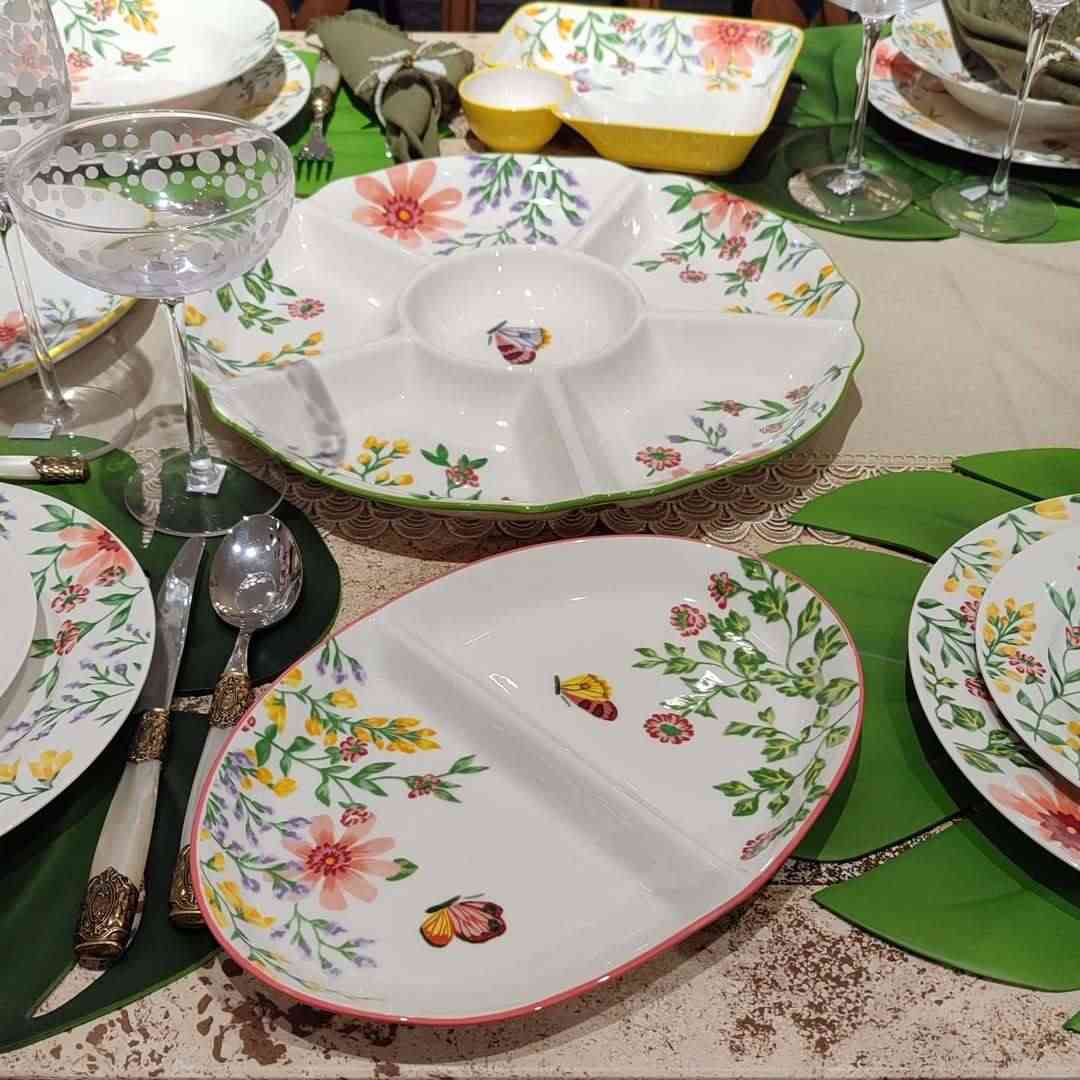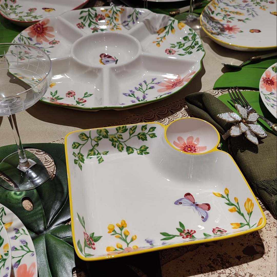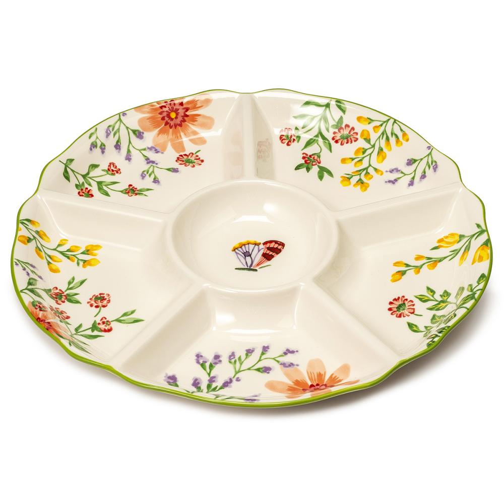 Кругла фарфорова менажниця Bouquet на 6 секцій прикрашена яскравим квітковим візерунком і тонким зеленим обідком, що надає їй витонченого вигляду. Ніжні малюнки польових квітів і метеликів створюють атмосферу весни та легкості на вашому столі. Менажниця зручна для подачі закусок, горішків, соусів або фруктів — усе виглядає гарно та охайно. Міцна фарфорова основа стійка до подряпин і легко миється, тому виріб практичний у щоденному використанні. Діаметр 38 см дозволяє розмістити частування для всієї родини чи гостей. Це елегантний акцент сервірування й чудовий подарунок для поціновувачів гарного посуду.