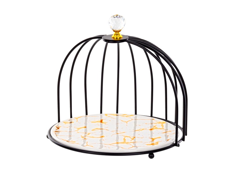 Круглое фарфоровое блюдо «Клетка» размером 20×20,5 см — это выразительный элемент сервировки, который придаёт столу аккуратный и продуманный вид. Основа выполнена из прочного металла в форме купола с матово-чёрным покрытием, а сверху украшена прозрачной декоративной ручкой, напоминающей кристалл. Внутри расположена круглая фарфоровая тарелка с мраморным рисунком и золотыми прожилками — она выглядит стильно и современно.