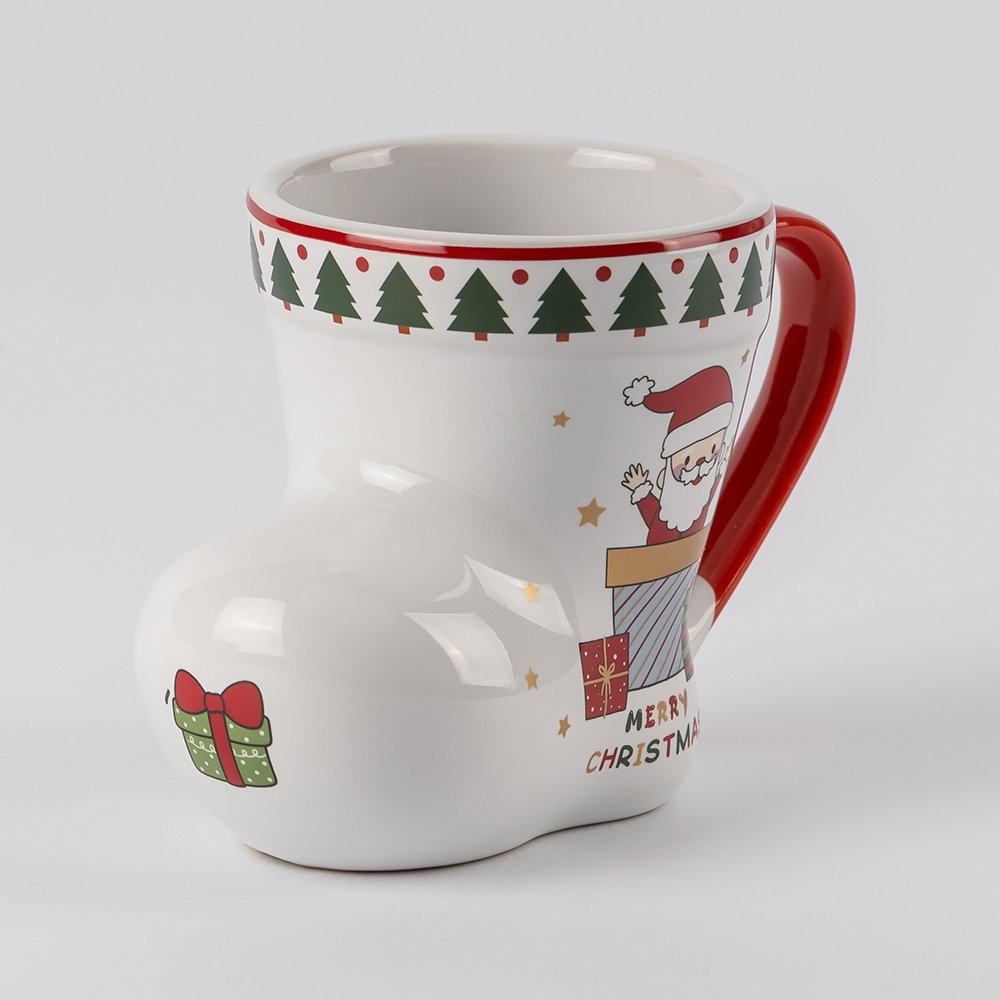 BootyCup – це маленький витвір мистецтва на вашій кухні! Горнятко у формі різдвяного чобітка миттєво створює атмосферу свята. На білосніжній поверхні – веселий Санта, подарунки та зелений бордюр з ялинок, а червона ручка додає яскравий акцент і чудово доповнює зимовий декор. Об’єм 250 мл підходить для улюбленої кави, запашного какао чи зігрівального глінтвейну, перетворюючи кожен ковток на справжнє задоволення.